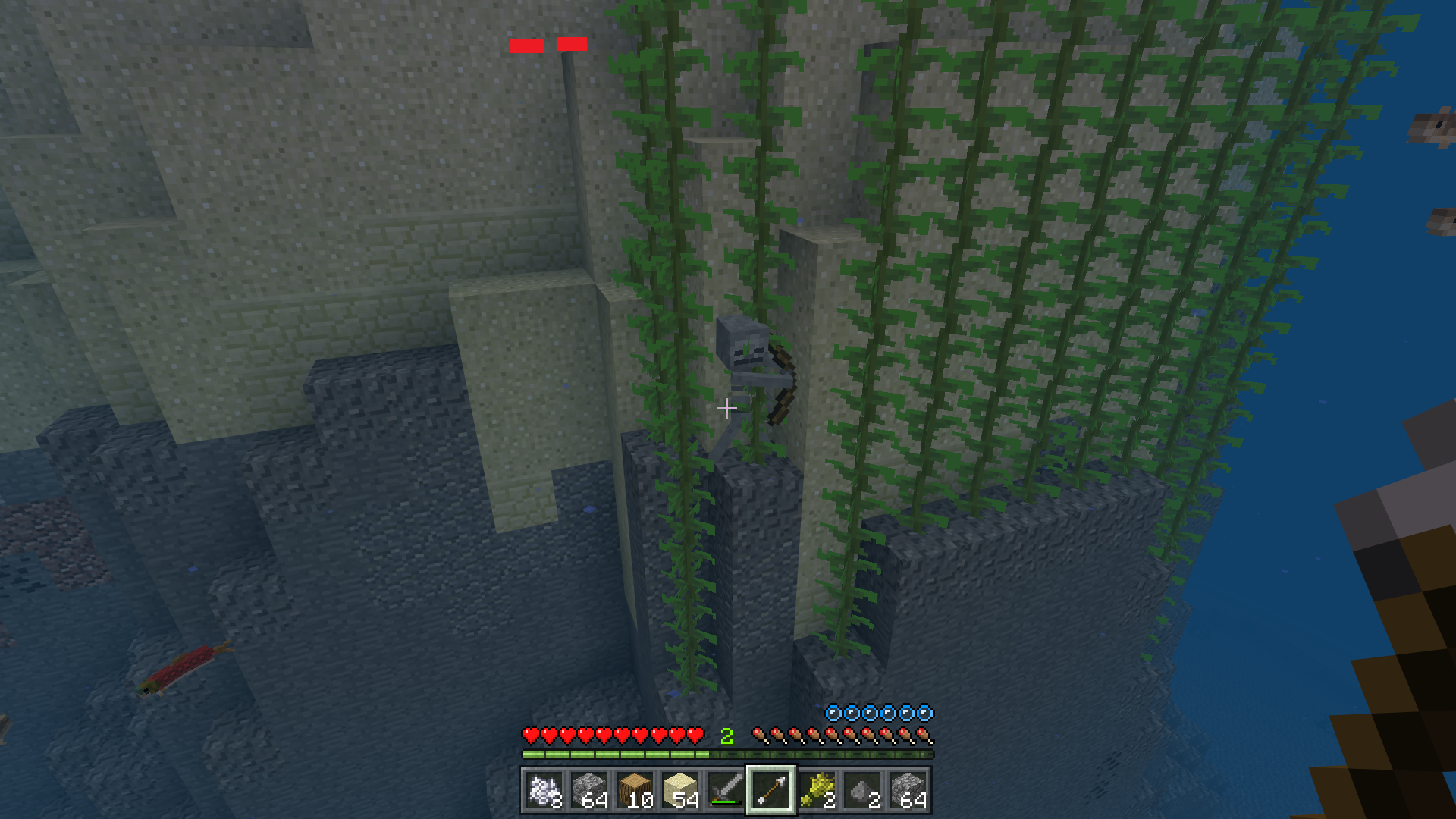 Went in the water and boom, there is a Skeleton in the bottom kelp block. Surprise, it didn't drown, didn't burn in the day and did not attack. Broke the second kelp block to see if it would liberate it but it didn't and still did not attack.