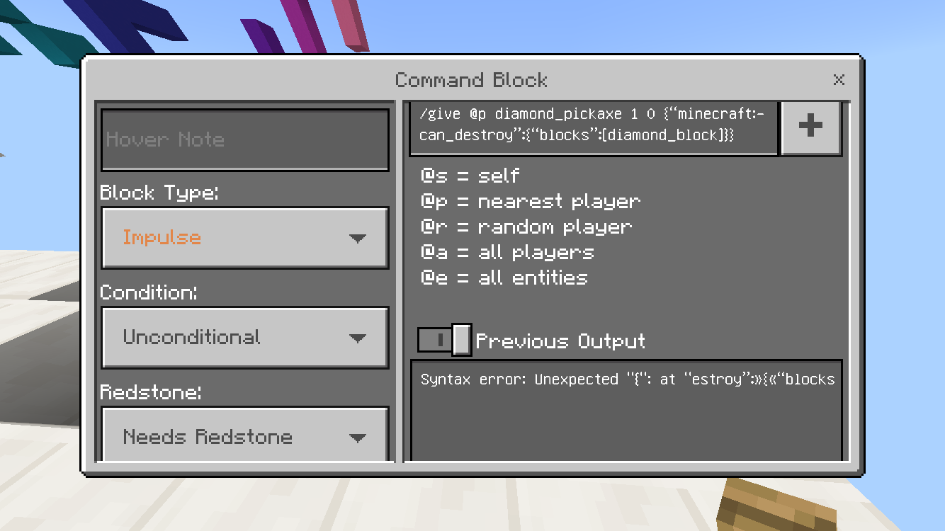 I wanted to get a diamond pickaxe that only breaks diamond blocks for my adveture map. But it say the whole time error.