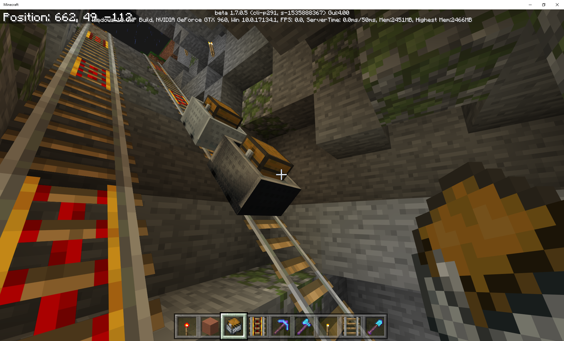 I was trying to build a gold mine in the mesa, I encountered a bug while testing the minecart. When the minecart move up a one block ramp, the minecart would glitch really badly, and glitch in the block under the rails. This only happens when the carts go upwards. Sometimes the minecart would completely disappear and no item would be dropped. Here's some screenshots. NOTE: I'm using a ported new minecraft defaults texture from Java.