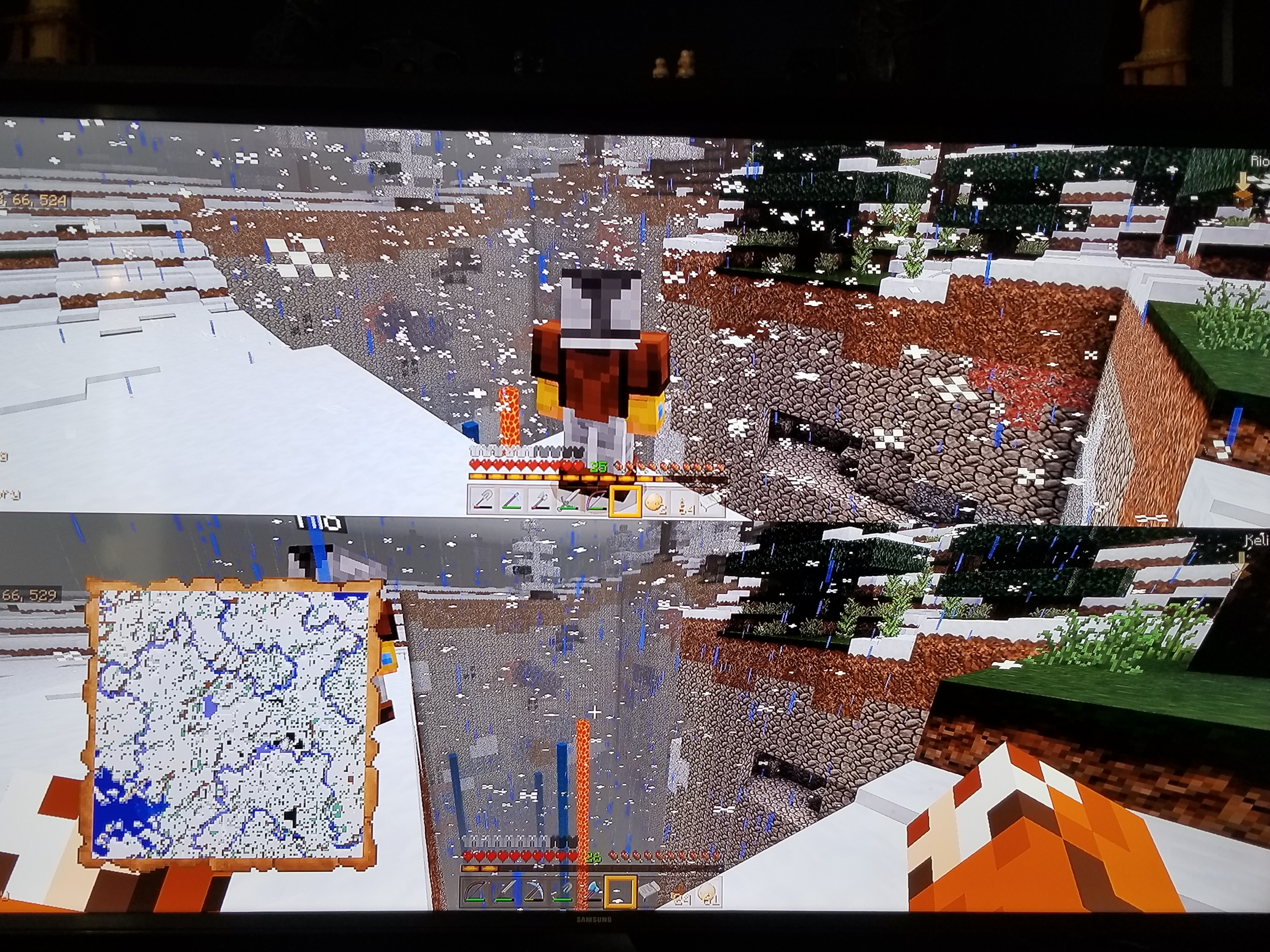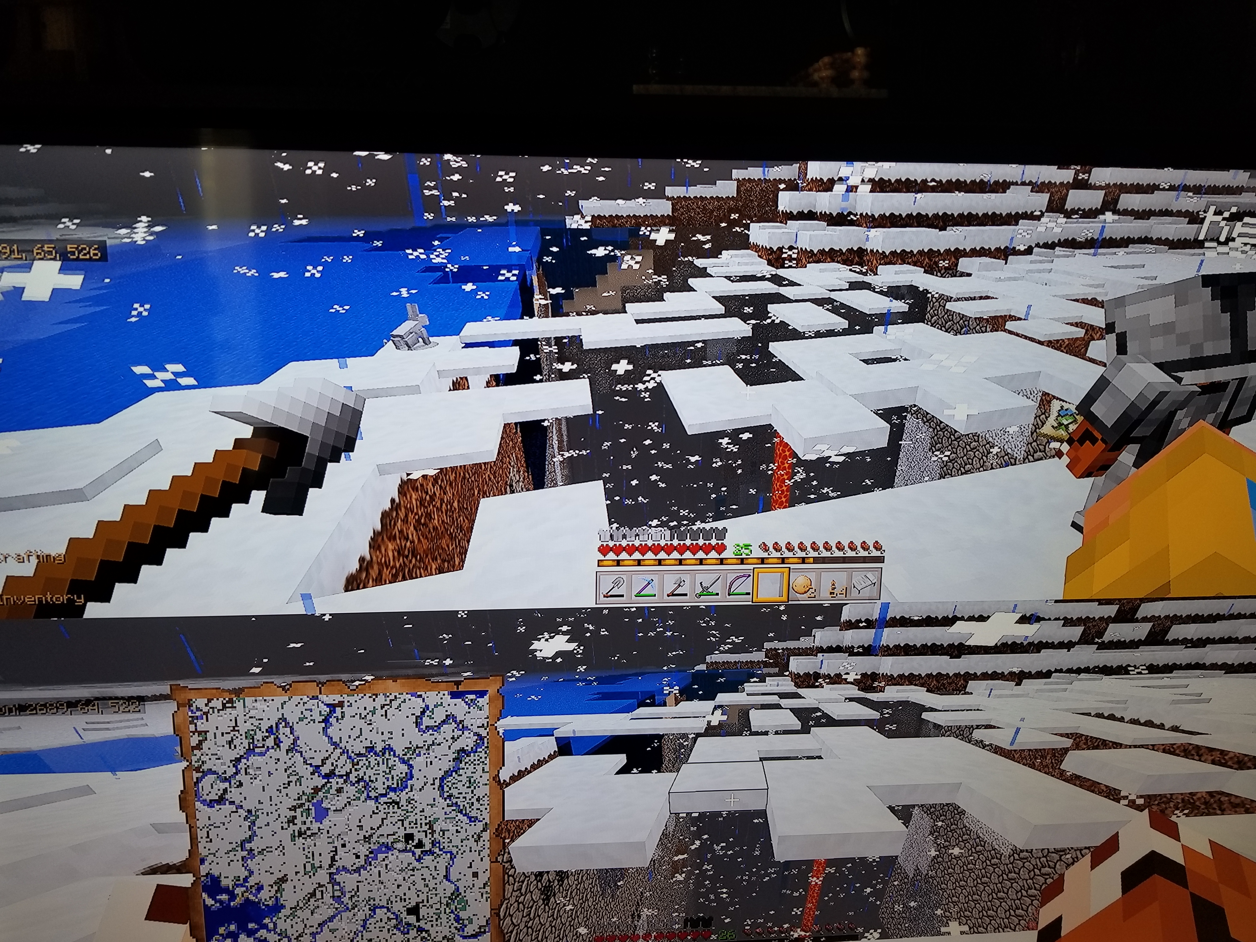 Three more added of another in-person destroyed chunk where it's showing and you can see the snow thinks there's supposed to be land there, and it'll sit and form, but then within a couple of seconds it falls down to the abyss because there are no actual blocks after the coding destruction destroyed the area.