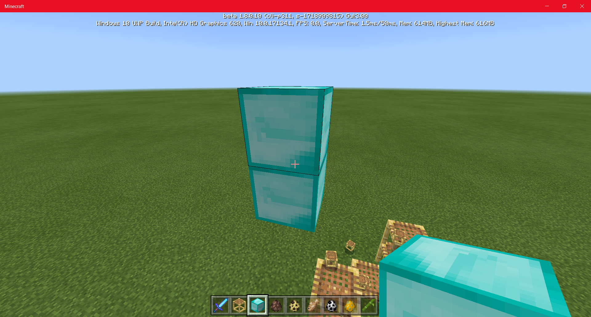 Placing another block (stone) under the 2-block high structure (by clicking on the underside of the placed block) (in this example diamond blocks) will turn the lower block into the new block type (stone).