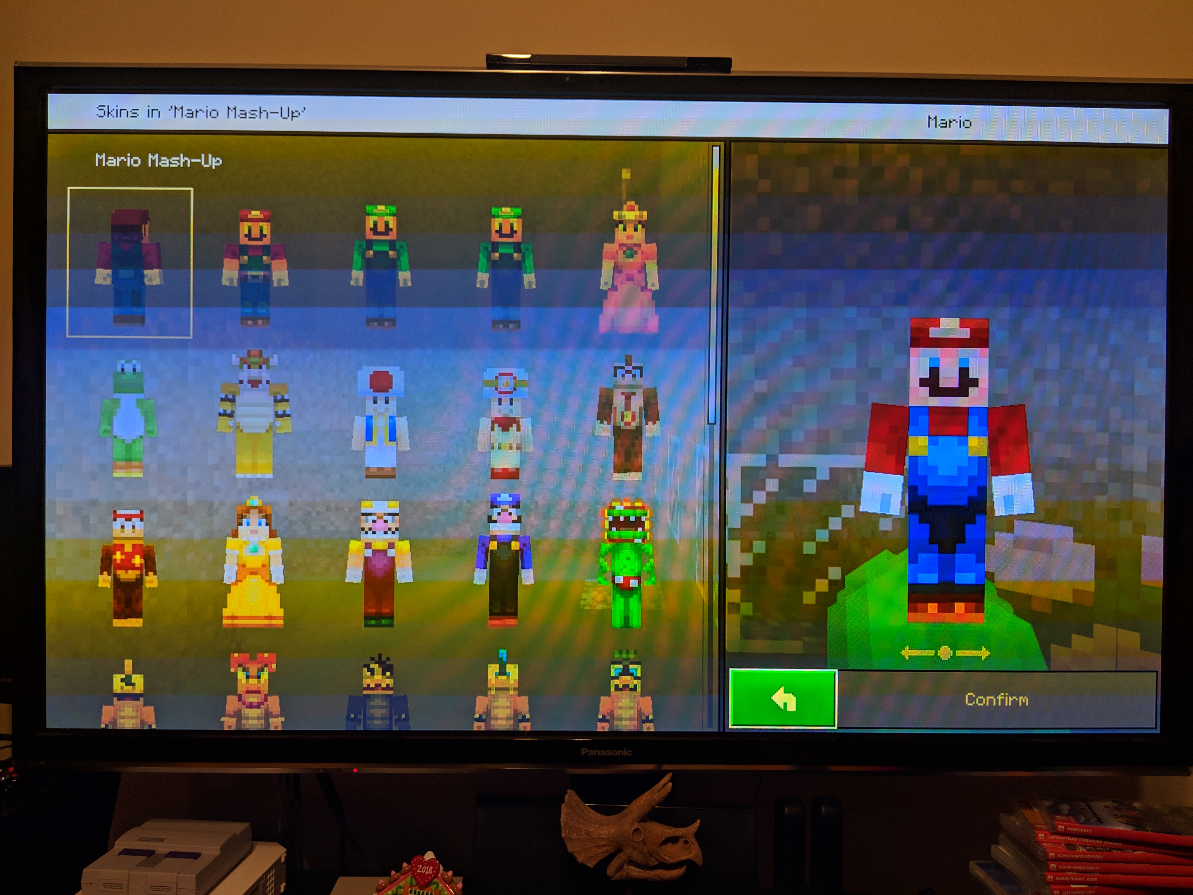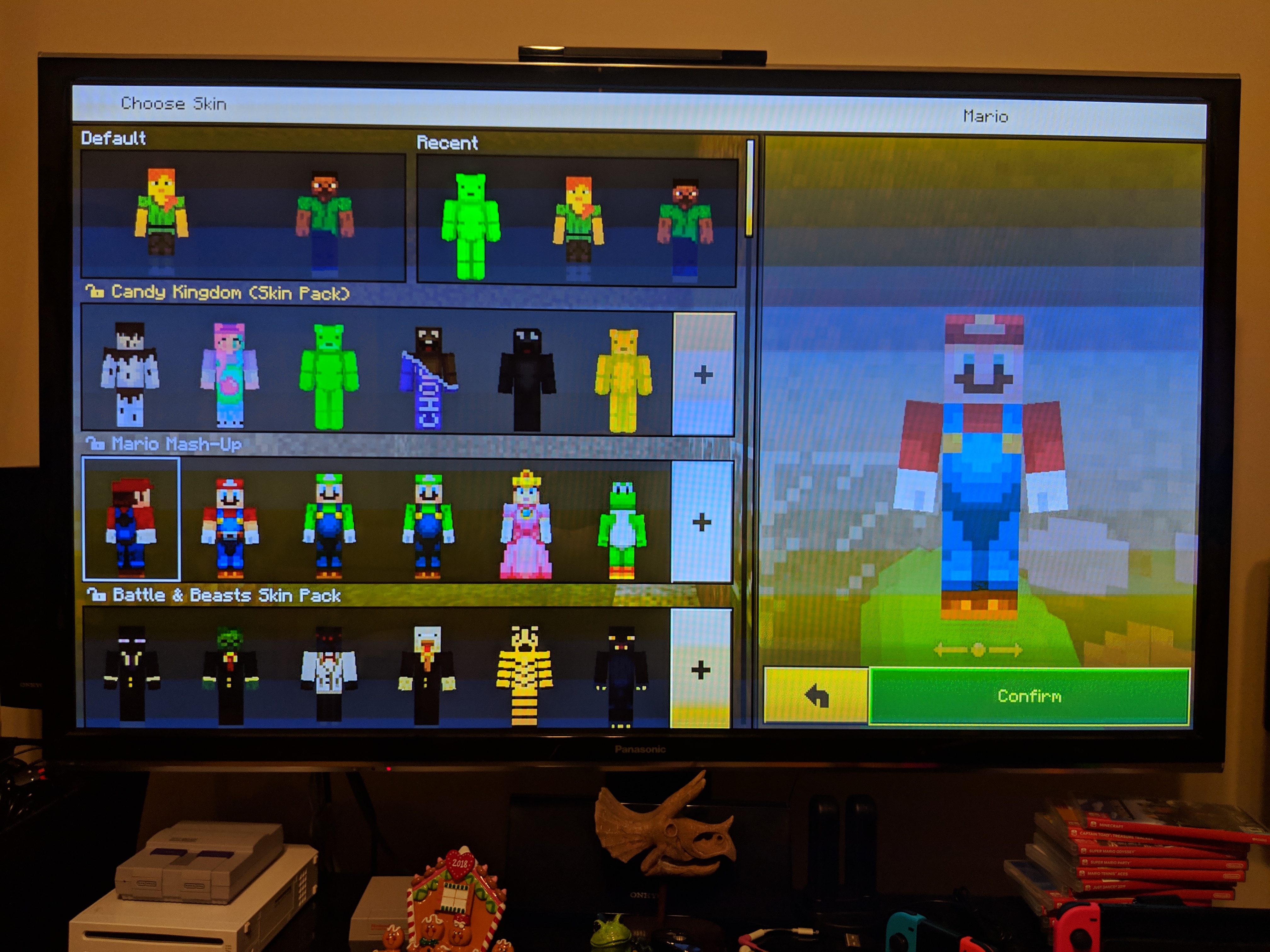 In the attached images, note that Mario can be selected in one instance (prior to clicking the plus symbol to look at all skins in a pack). If the plus symbol is clicked, all skins can be viewed, but the Confirm button is disabled for all skins.