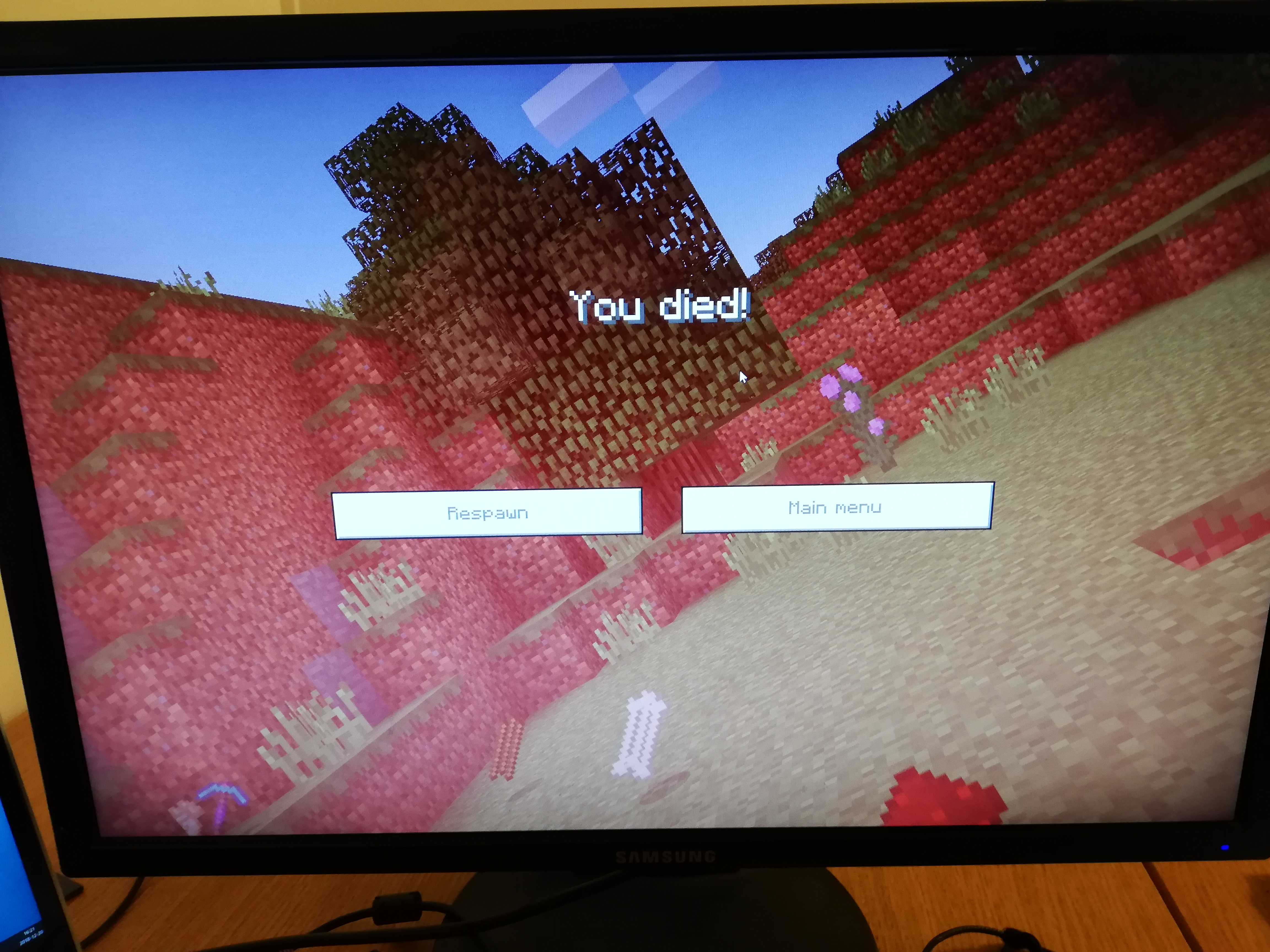this happened another time aswell, this time after saving and exiting, and at my base, middle of dessert, inside, also teleported to another place completely, welcomed by "you died" messege. far away. (have searched for equipment far around with no luck)