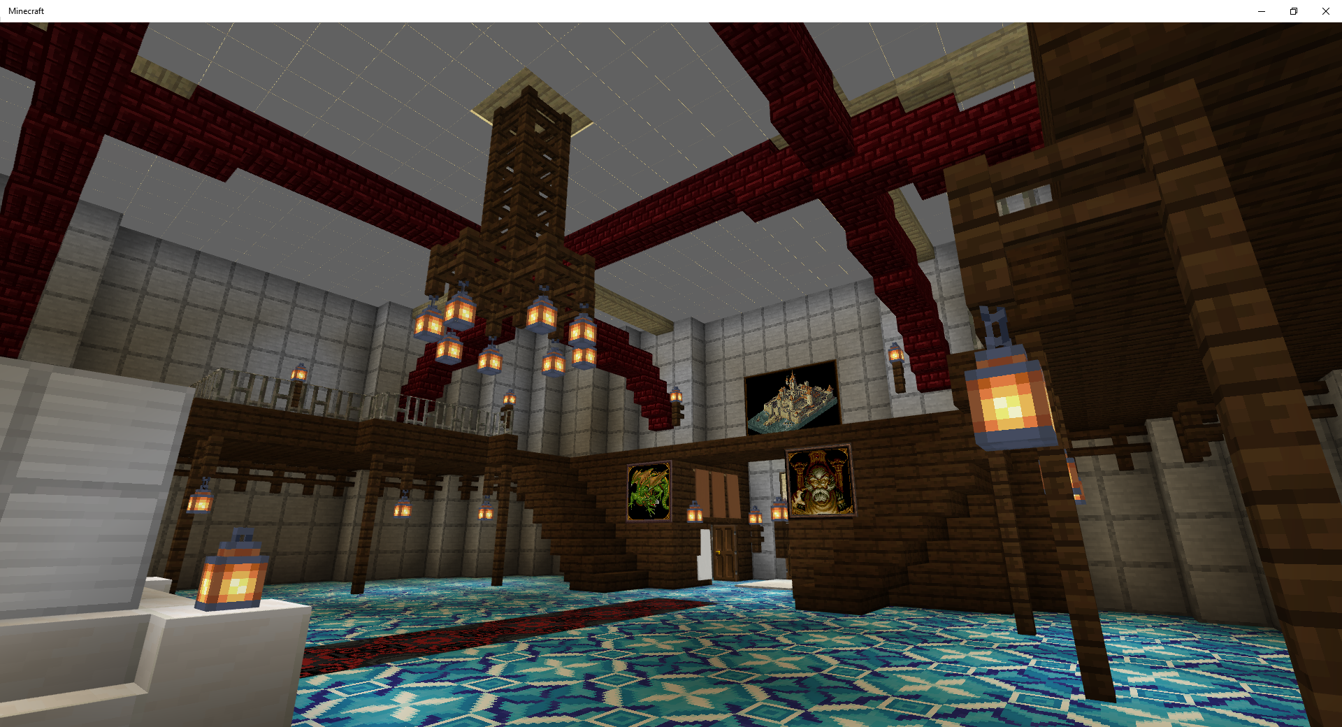 I am experiencing this in a realm with version 1.14.60. I built a 28 block diameter round building with multiple floors. The ceiling of the lower floor is a lit up white drop ceiling created by placing Jack o'Lanterns on top of slabs, then removing the slabs and placing an item frame and map on the bottom of each Jack o'Lantern. The maps were created by levelling an entire 128x128 (map size) tundra field to create an all white map. Then used an anvil to change the map name to a space character, then made enough copies of the map to cover the ceiling. The top of the Jack o'Lanterns is covered with carpet and is the floor of the second story. Now I see lag when eating food or breaking blocks. When breaking blocks the item breaks but jumps around for several seconds before it finally falls to the ground. The attachment Minecraft 4_19_2020 10_10_22 shows the room with the large map filled ceiling.