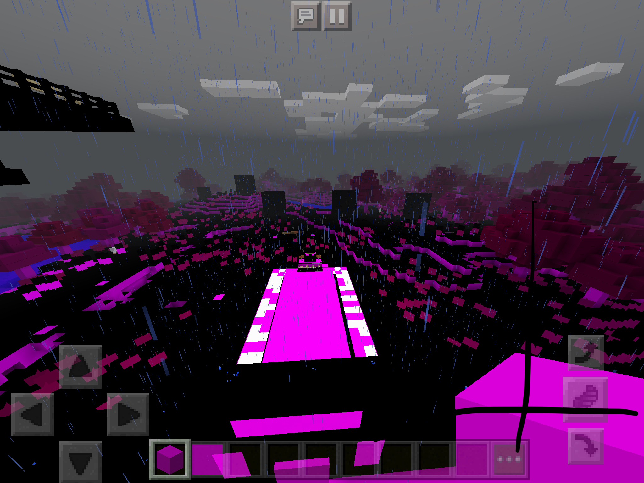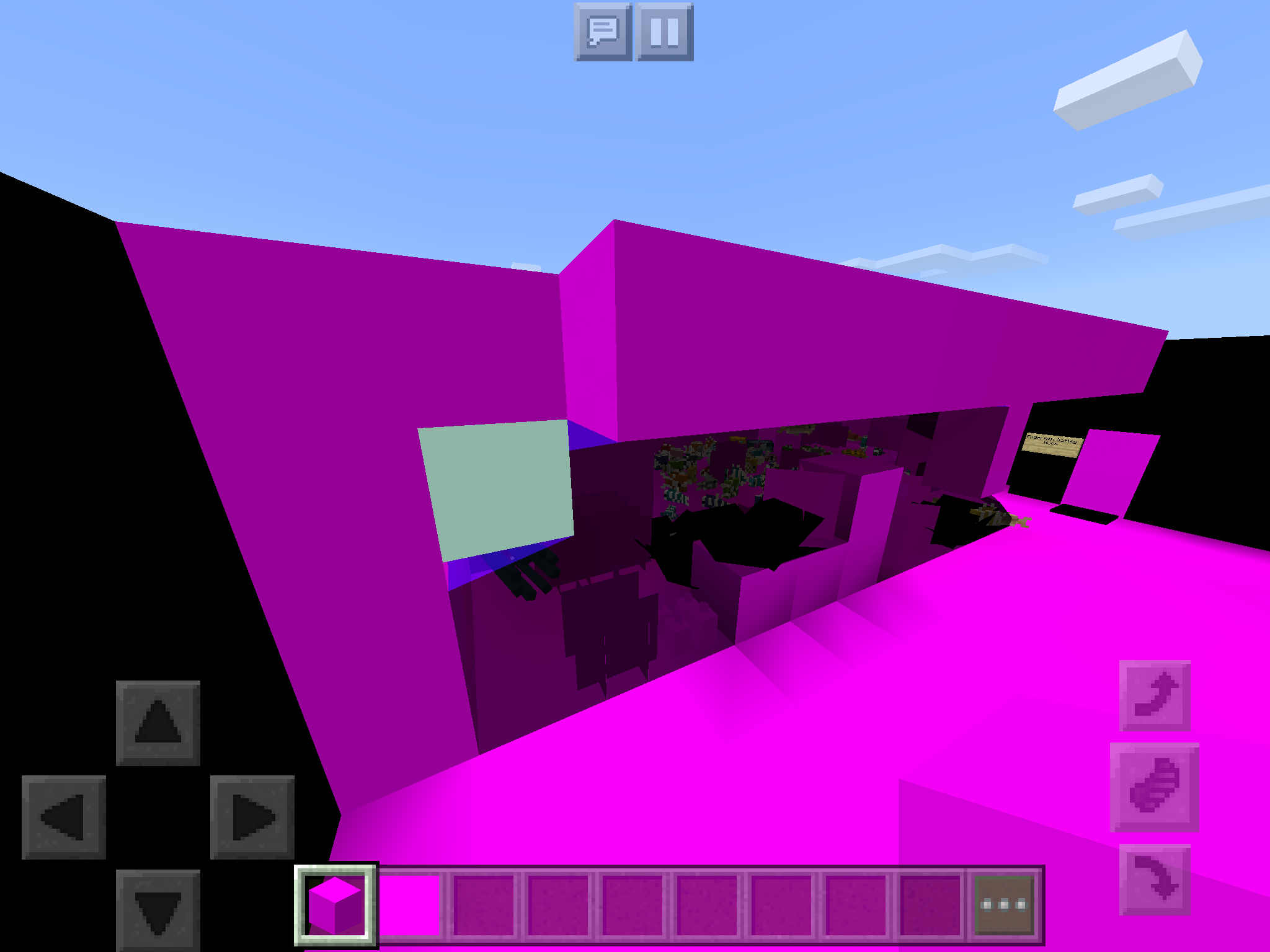 Occasionally when I leave Minecraft open for about 10 minutes with the screen off (so app is open in background) and then switch back onto it after coming off to put music on from Spotify everything in my world turns black or pink, except mobs, and the blocks in my ineventory lose their textures but instead of displaying the Missing Texture (black and pink checks) texture, they turn pink. The block in my inventory in the screenshots is Stone Bricks. This is a Creative world. All the sounds work right though, and although I wasn't able to get in the screenshots the lava moat in the enrance to my unfinished mansion is pink with parts that flicker from white to turquoise. I fixed this by restarting the world (save and quit and going back to the world from menu). The world preview was in black and pink too. This is fixable but annoying when it happens.