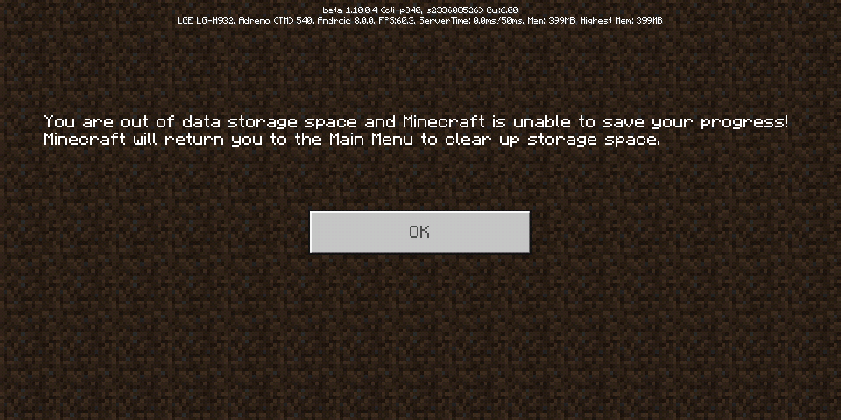 Ever since Beta 1.10.0.4, my worlds have suddenly stopped and a message appears saying my memory is full and Minecraft is unable to save my progress. This has never occurred before prior to this update.