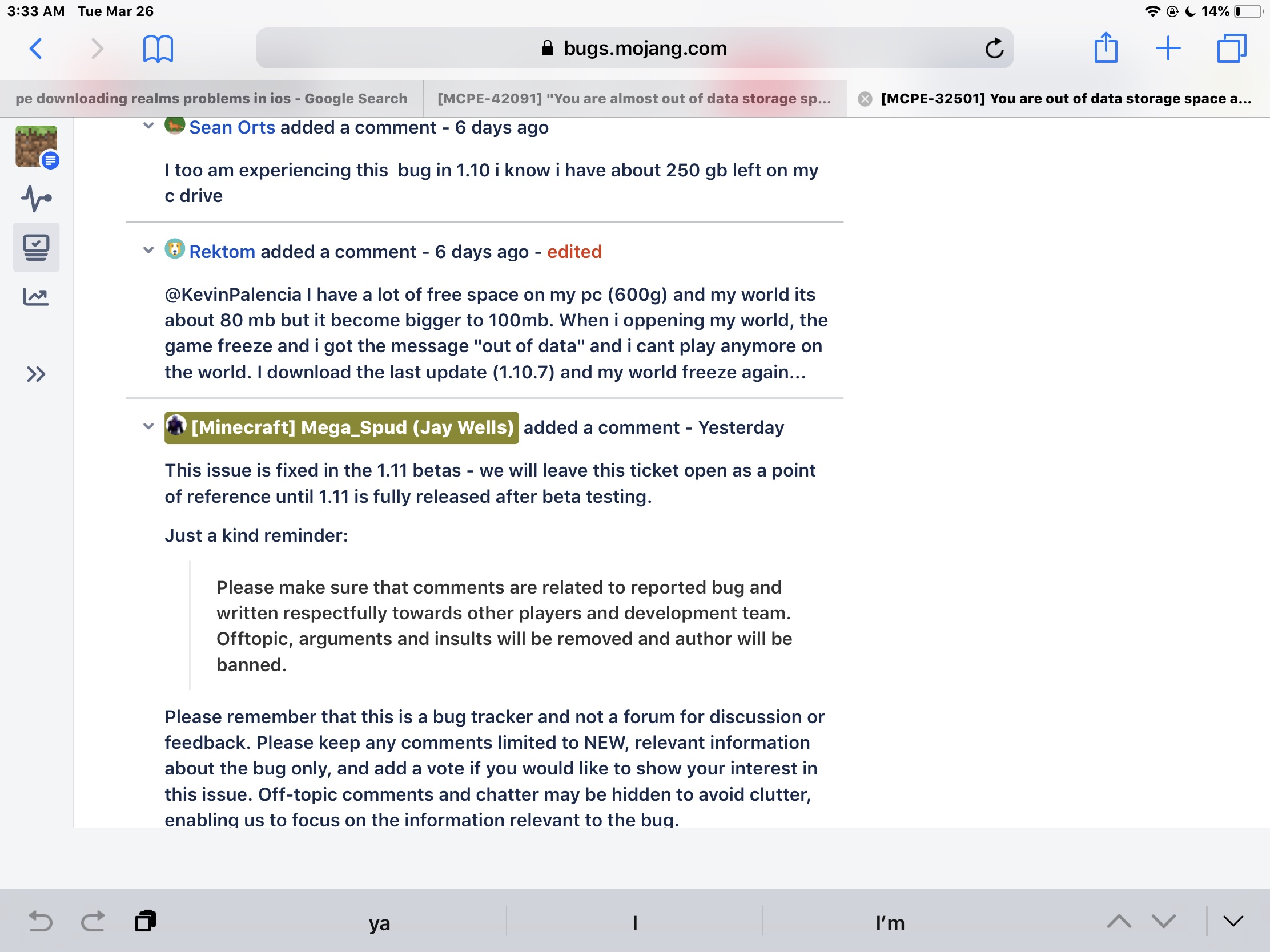 Just tested it on my iPod, which has no saved worlds on it. Absolutely 0 GB of saves. The storage capacity is 32 GB with 19 GB available. And I still get the message that I’m almost out of data storage space. Bedrock 1.14.2 on iOS 13.3.