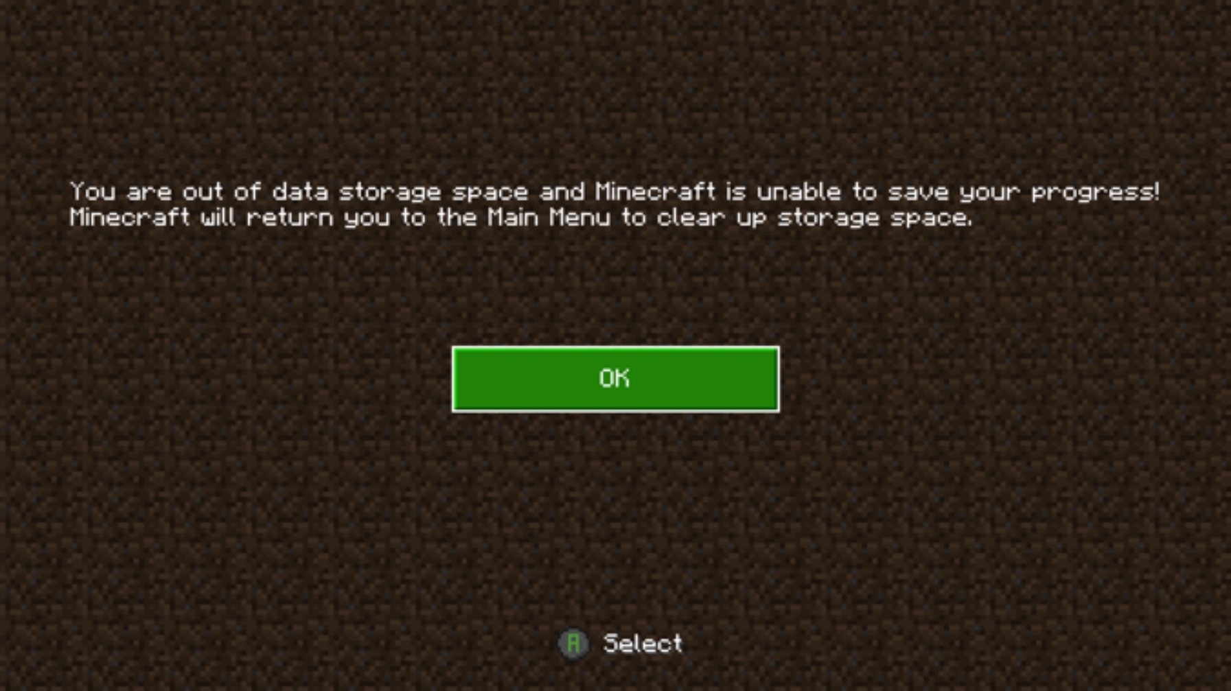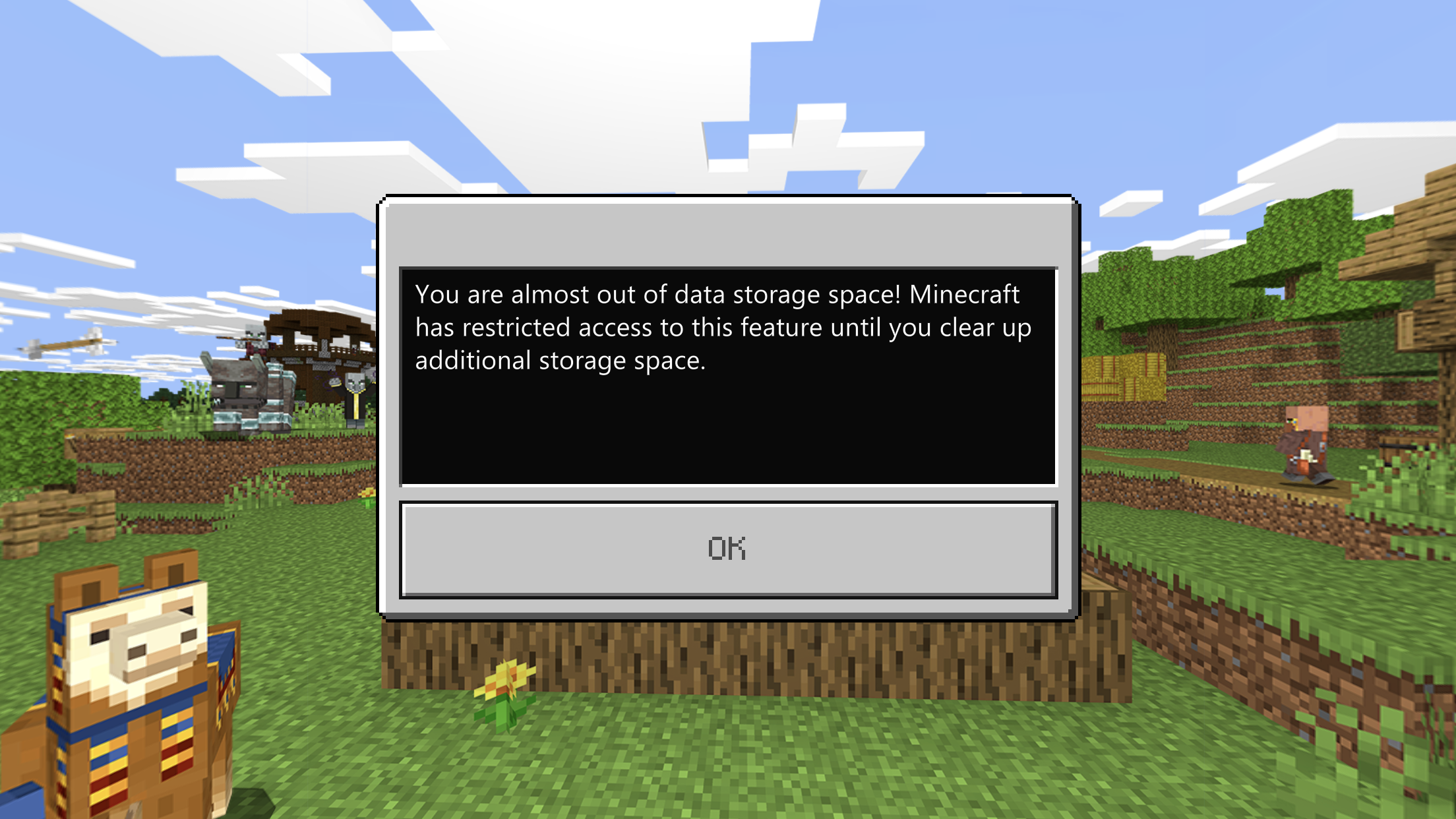 "You are almost out of data storage space! Minecraft has restricted access to this feature until you clear up additional storage space."