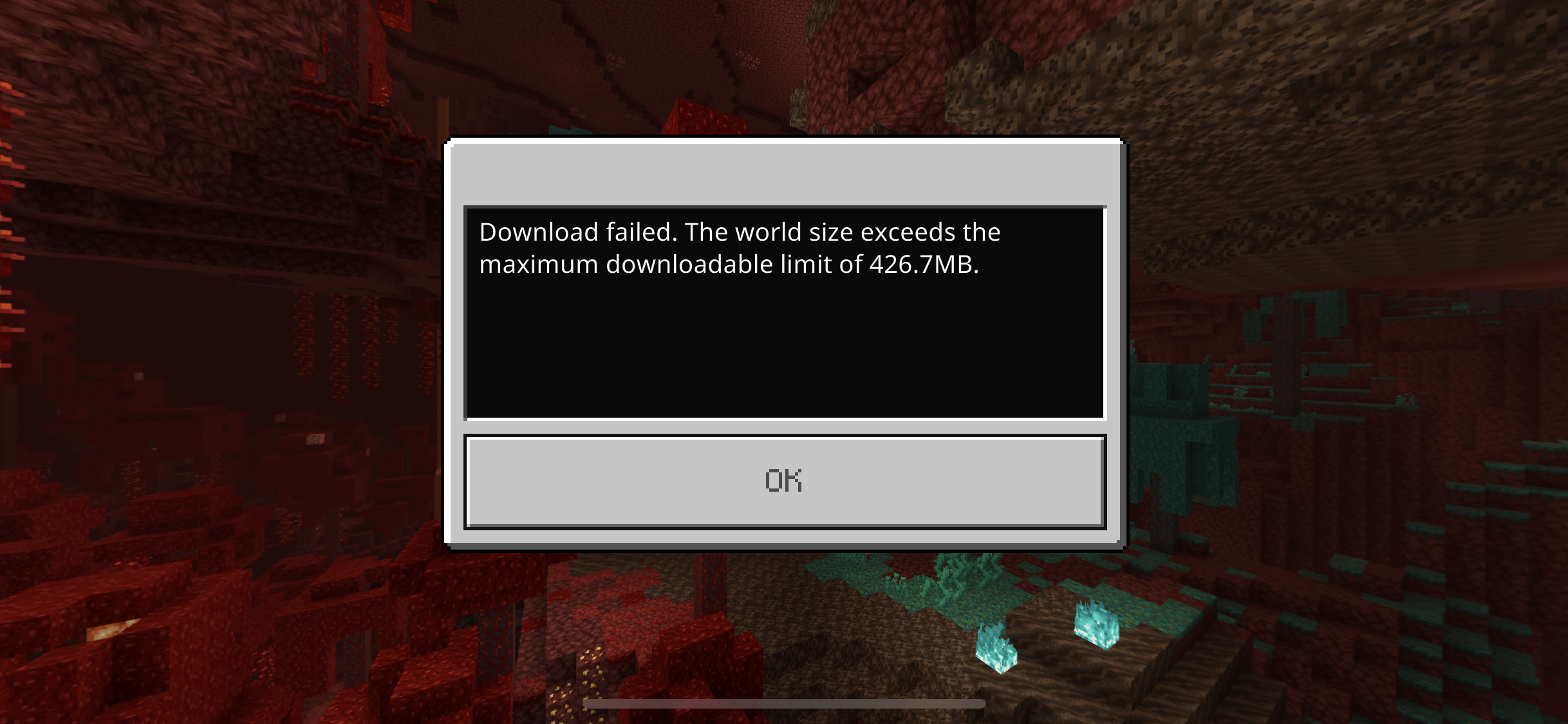 "Download failed. The world size exceeds the maximum downloadable limit of 426.7MB."