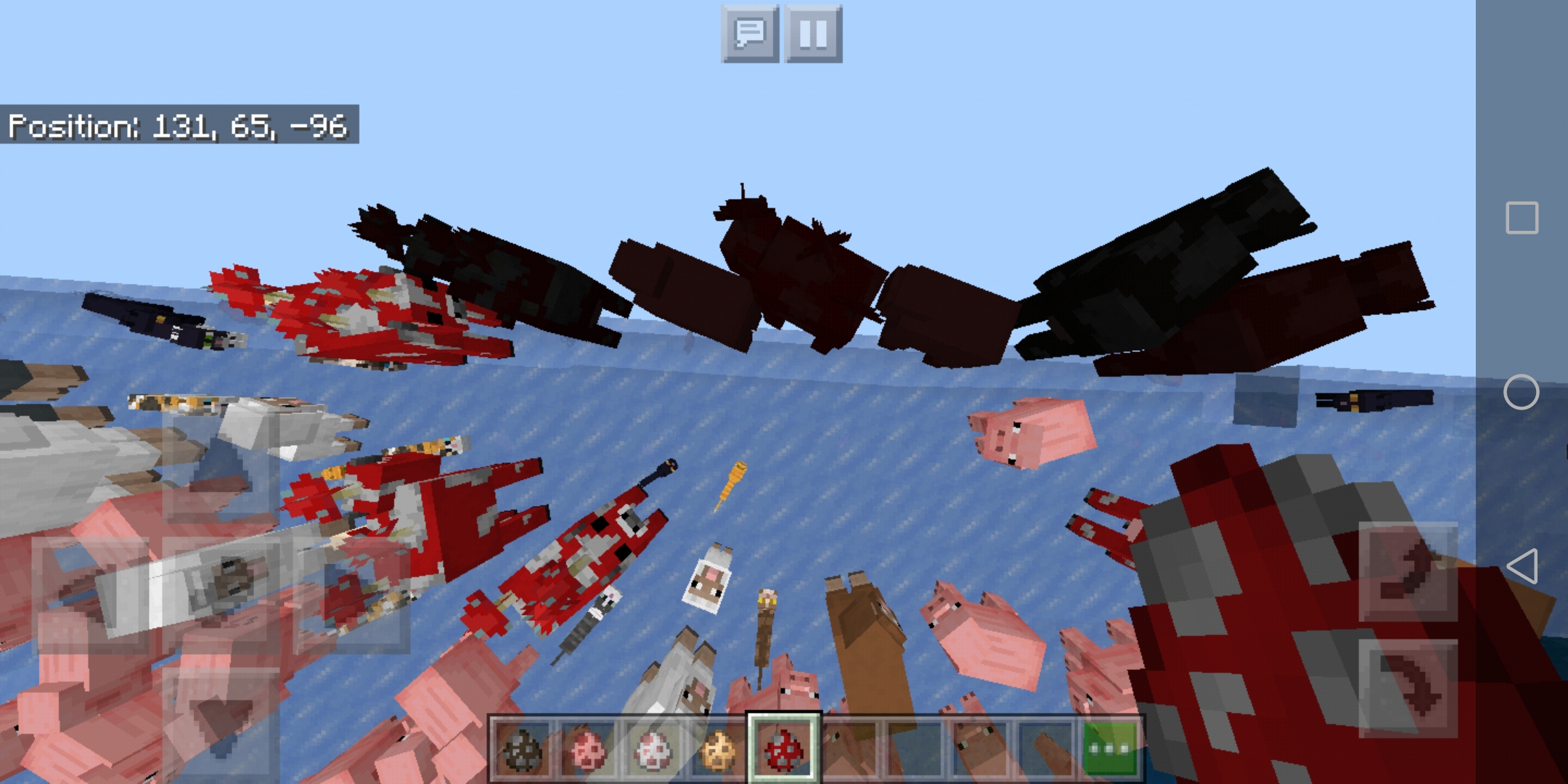 In Creative mode, get a spawn egg and spawn mobs near the border. If you're lucky and get the angle just right, the mob will be dark and frozen outside the world. Hitting it will make it keep the red shade forever and effectively make it invincible. Interestingly, I somehow managed to get a dead mob beyond the border and it stayed in the death animation. I tried this on three worlds with Cows, Sheep, Mooshrooms and Cats and it worked semi-consistently, with variation based on entity pushing and spawn egg randomness.