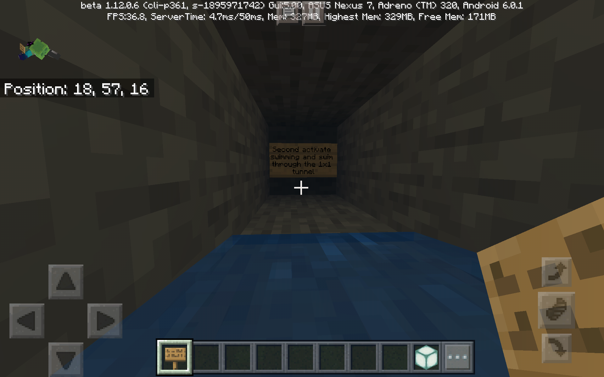 If you dig a 1x1 tunnel while you are on flowing water, you can swim without any water. This is not the official"crawling feature" that was added on the Java Edition. Yes, crawling is a feature on Java Edition but don't get me wrong, it wasn't added yet to the Bedrock Edition.