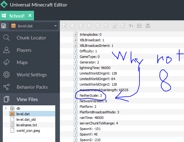 The worlds transferred from consoles only for Classic/small and medium-sized worlds aren't an 8:1 (1 block in nether = 8 blocks overworld). Small is 3:1 and medium is 6:1. I played on my transferred world from the legacy consoles. I found this out when playing using nether portals to travel, it was a small distance traveled, 1000 in nether to 3000 in over. 8000 is bigger than 3000. This bug needs to be fixed for all worlds soon. Fixing traveling quickly. Make the nether scale from 3/6 to 8.