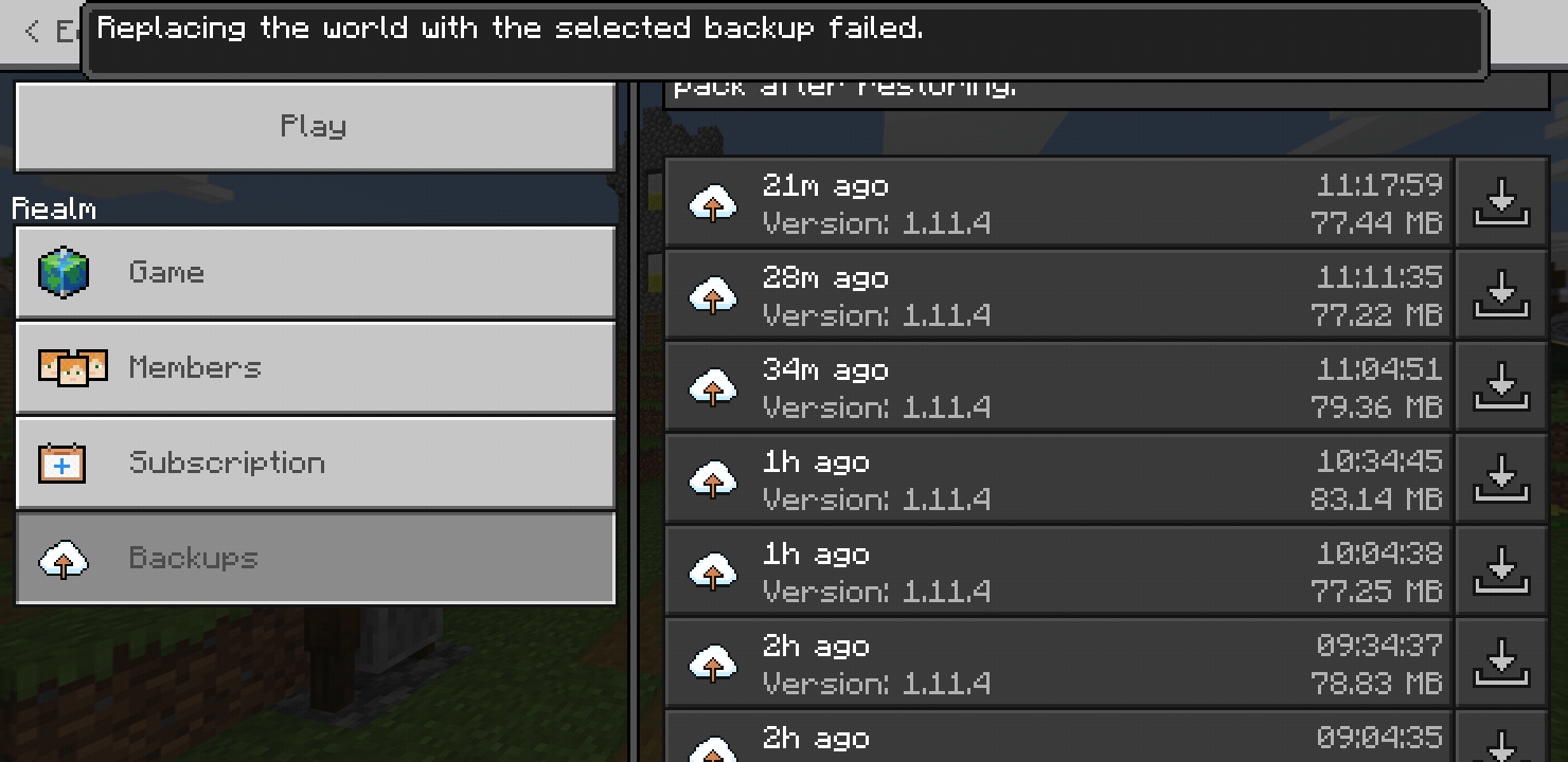 I wanted to stop greifing on my realm, so I created a copy of the world with fire spread and TNT explode off. Beforehand when I uploaded a copy, I had canceled when it said initializing upload, as it had successfully replaced the world anyways. However, when I did it this time, it would not let me join the game. It also did not let me replace the world with a backup. I was forced to reset the world, and now when I try replacing the new world with the old copy, it is no longer stuck on the screen saying "This may take a few moments, but it loads me into the world I was trying to replace in the first place.