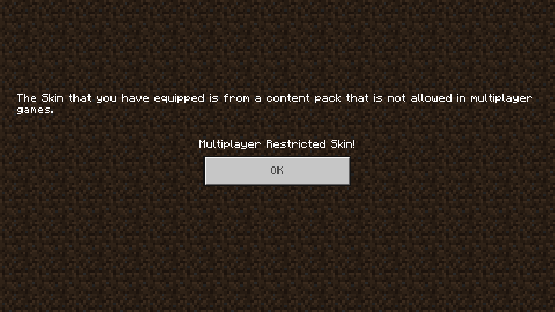 When attempting to join a server, I get a multiplayer restricted skin error even though I am using one of the two default skins that says is usable. Once I select the other skin, I can tap on a server and it will then attempt to connect, but it never does and says a timeout occurred. This happens if I try to connect to my home server or an external one as well.