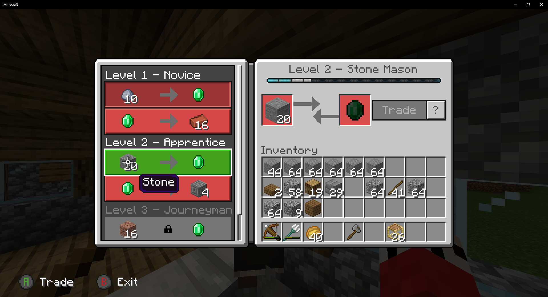 While trying to complete the stone mason's tier 2 trade of ~20 stone for 1 emerald, no matter how much stone I have in my inventory, the trade is marked as unable to be completed (it is highlighted in red). This affects me on multiple saves, so I know it isn't a once in a while problem, as I have yet to find a mason that will complete this trade.