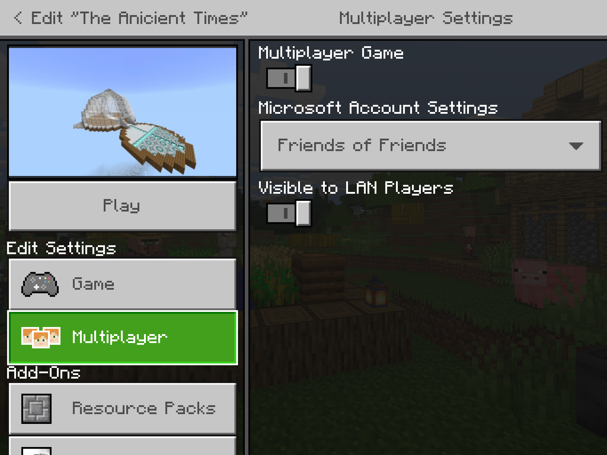 I’ve been playing Minecraft for awhile now but the new update has becoming a little confusing. Before going into a world, 99% of the time it asks you to change your skin (due to not being able to use it in multiplayer), so that has been what I have been doing. When playing, I accidentally pressed on continue. The skin changing notification says it disables multiplayer on that world, but I just ignored that, thinking that I could change it back to multiplayer later. When trying to play Minecraft with my friend later in the day, I found that she could not join my world. So I went into the world edit and turned the multiplayer on and pressed play. My friend could still not join. I checked the multiplayer settings in the world, and they were off and grayed out. I though that I forgot to turn them on so I turned them on in world edit and went in again. When I looked at the world settings ingame, they were still off.