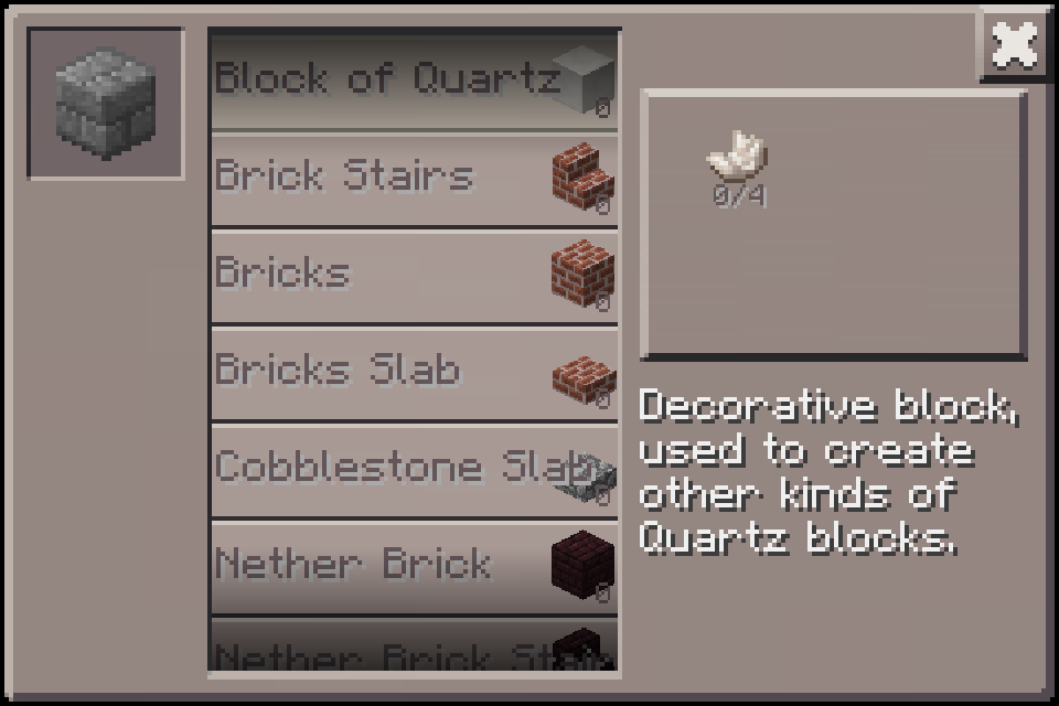 chiseled quartz block and pillar quartz block can not be crafted in survival mode