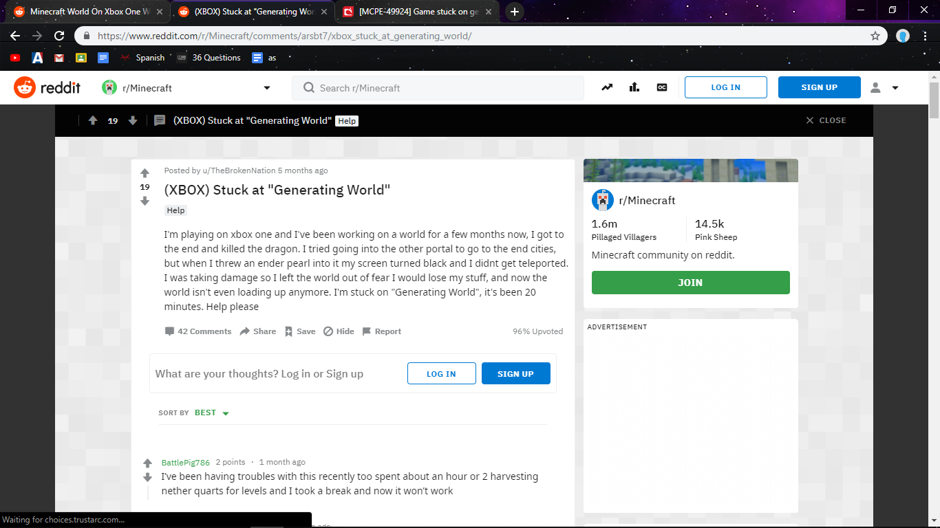 Hello, I was recently playing Minecraft windows 10 edition in the Xbox one and I have a world that I put hours to. Today I decided to load in but my screen is stuck on generating world. I noticed that many others have this problem. I’ve tired almost everything in the book. For example I’ve reset my Xbox, created a copy of my world, etc. Please fix it is a game breaking bug. Thanks.