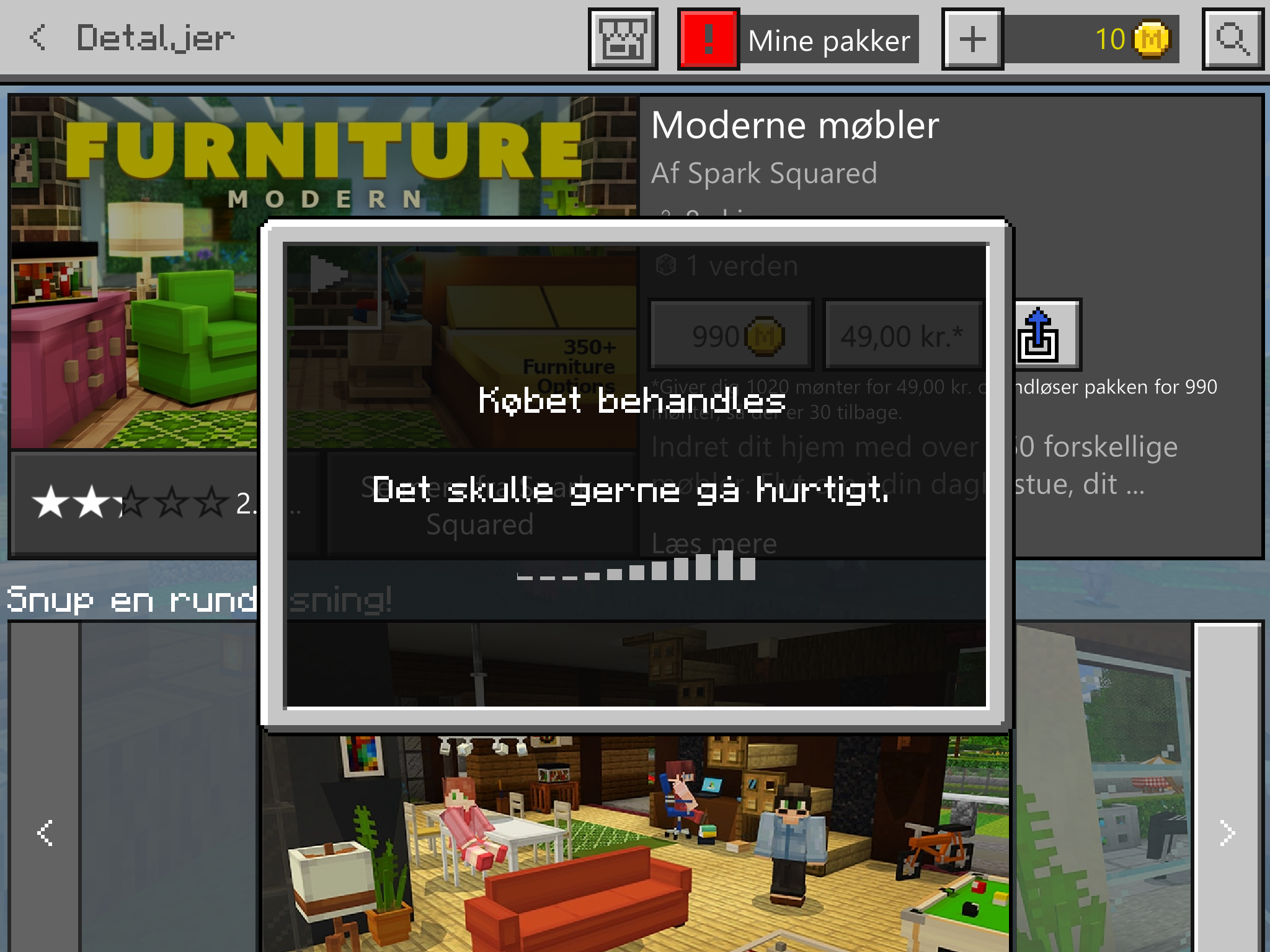 when purchasing Furniture Modern resource pack the entire program freezes on downloading screen. The purchase sequence was okay, says that purchase is already done and that it will recreate and then the game freezes. Screenshot attached, it is in danish...
