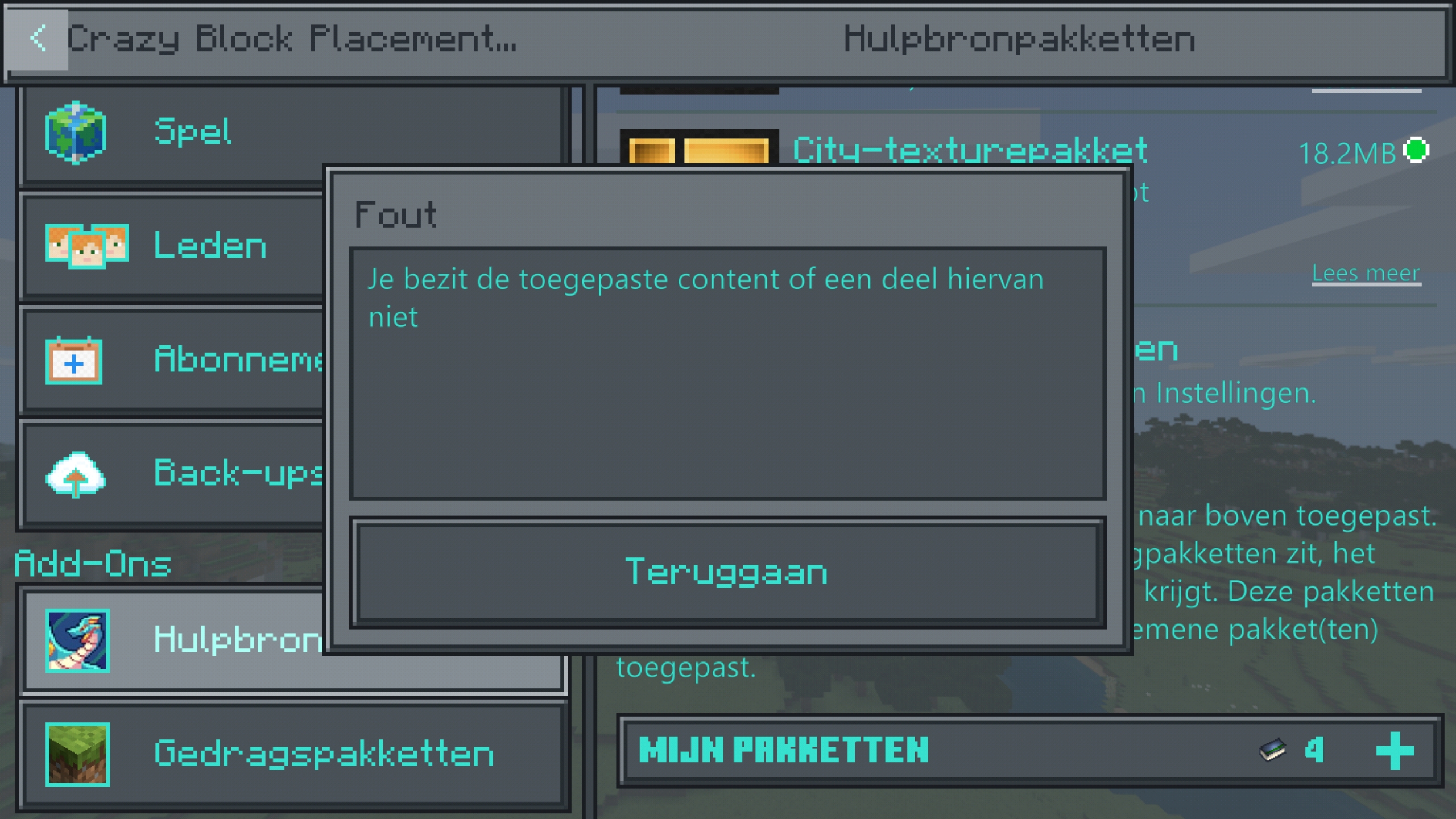 After the last update, my realm looked weird. It appears there is a recourse pack active. One that I never purchased. When trying to deactivate it, the game throws an error stating something like I don't own this pack, "purebdcraft", or parts of it. I can't get rid of it!