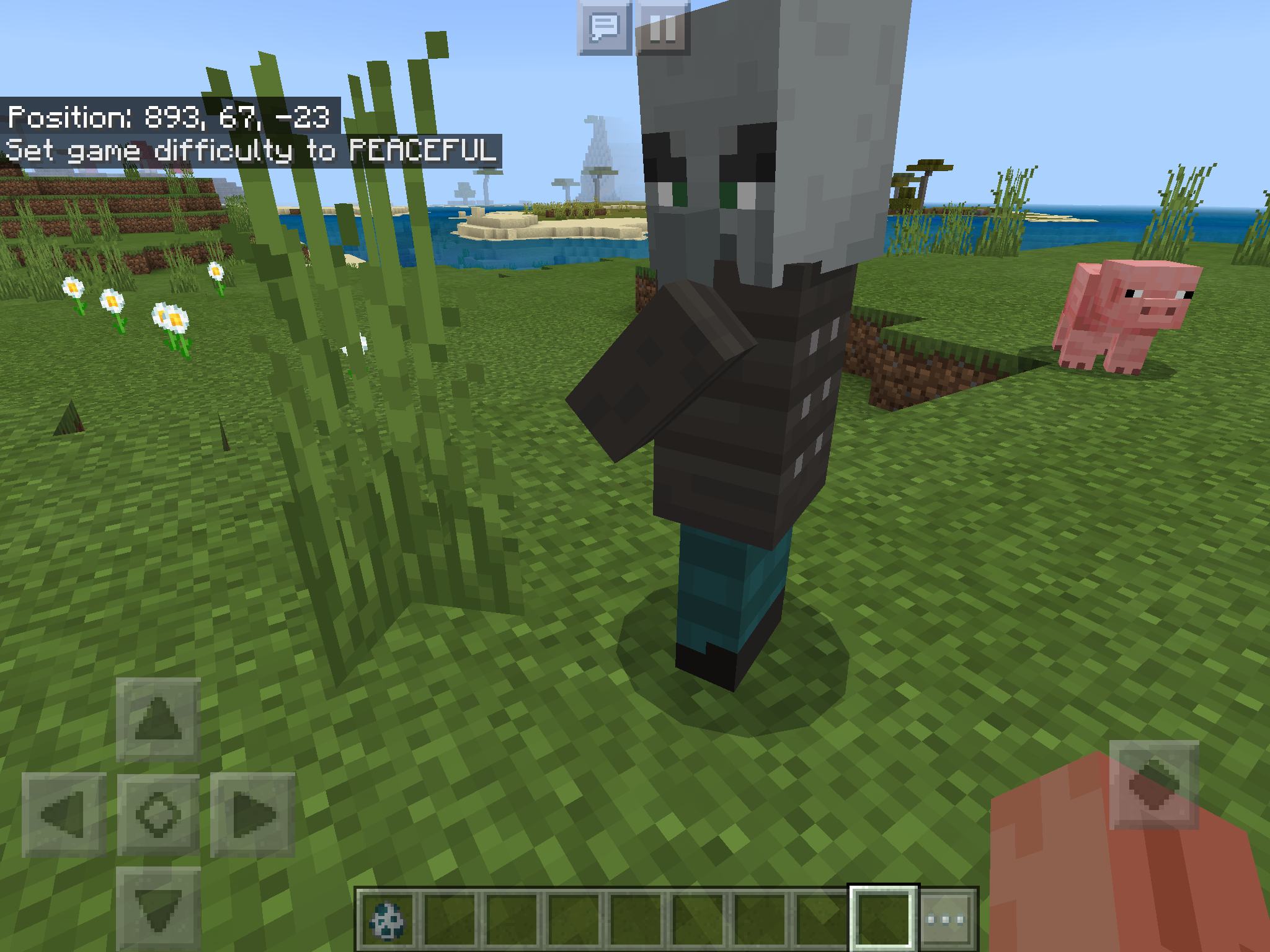 The Vindicator mob for some reason will not despawn if the difficulty is set to “Peaceful.” I don’t know if this was intentional, but this makes the game a whole lot less “Peaceful.” In the screenshot, it shows a Vindicator still standing there, not depawning. The other screenshot shows the Vindicator is still very much aggressive.