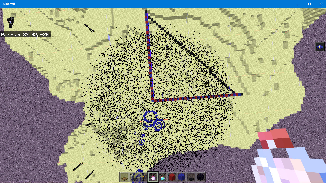 *As seen in the screenshots, the radius seems to vary from 20–30 blocks, depending on distance. From the player's perspective, they escape the effect's are moving 30 blocks from the center. In the overworld & nether, potions seem to have the normal area (but still black).