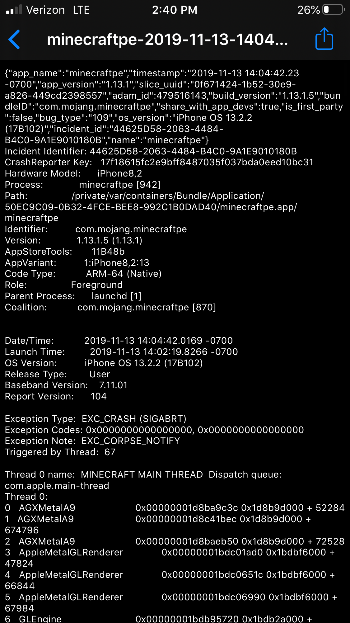 I recently updated to iOS 13.2.2 since my phone was kinda out of date, I updated Minecraft to 1.13.1 and it still crashes during gameplay. I am not sure what exactly causes it..