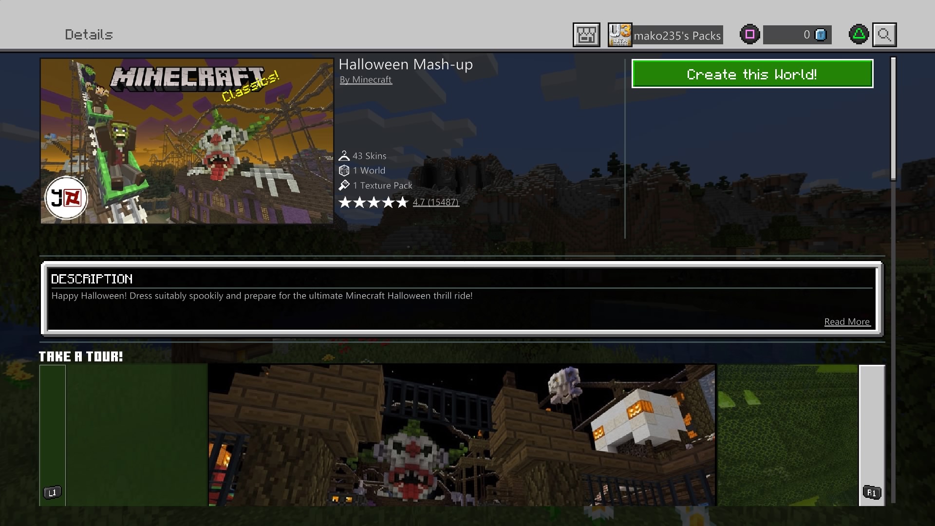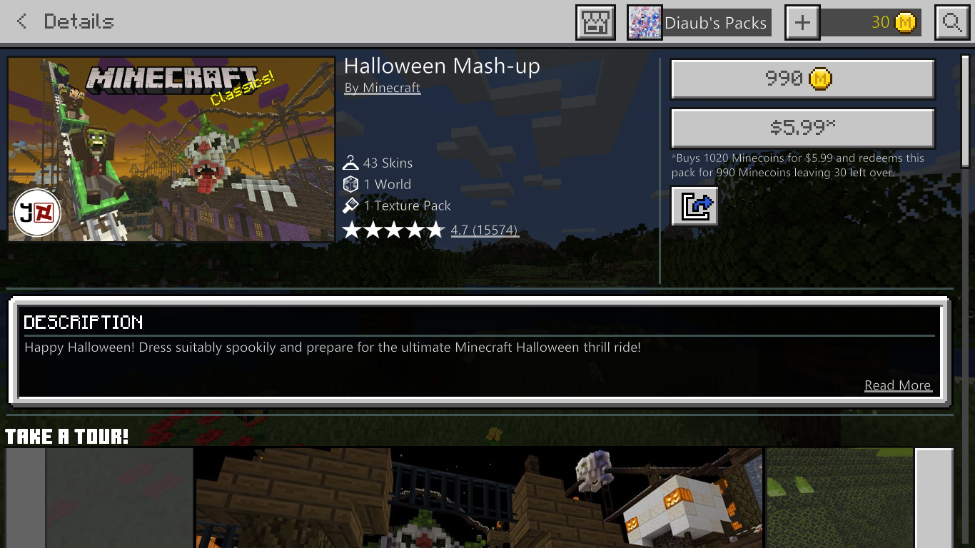 A screenshot from Windows 10 Edition signed into the same Live account as the PS4 Bedrock screenshot above. Halloween Mash-up purchase failed to transfer to Windows 10 Edition from PS4 Bedrock.