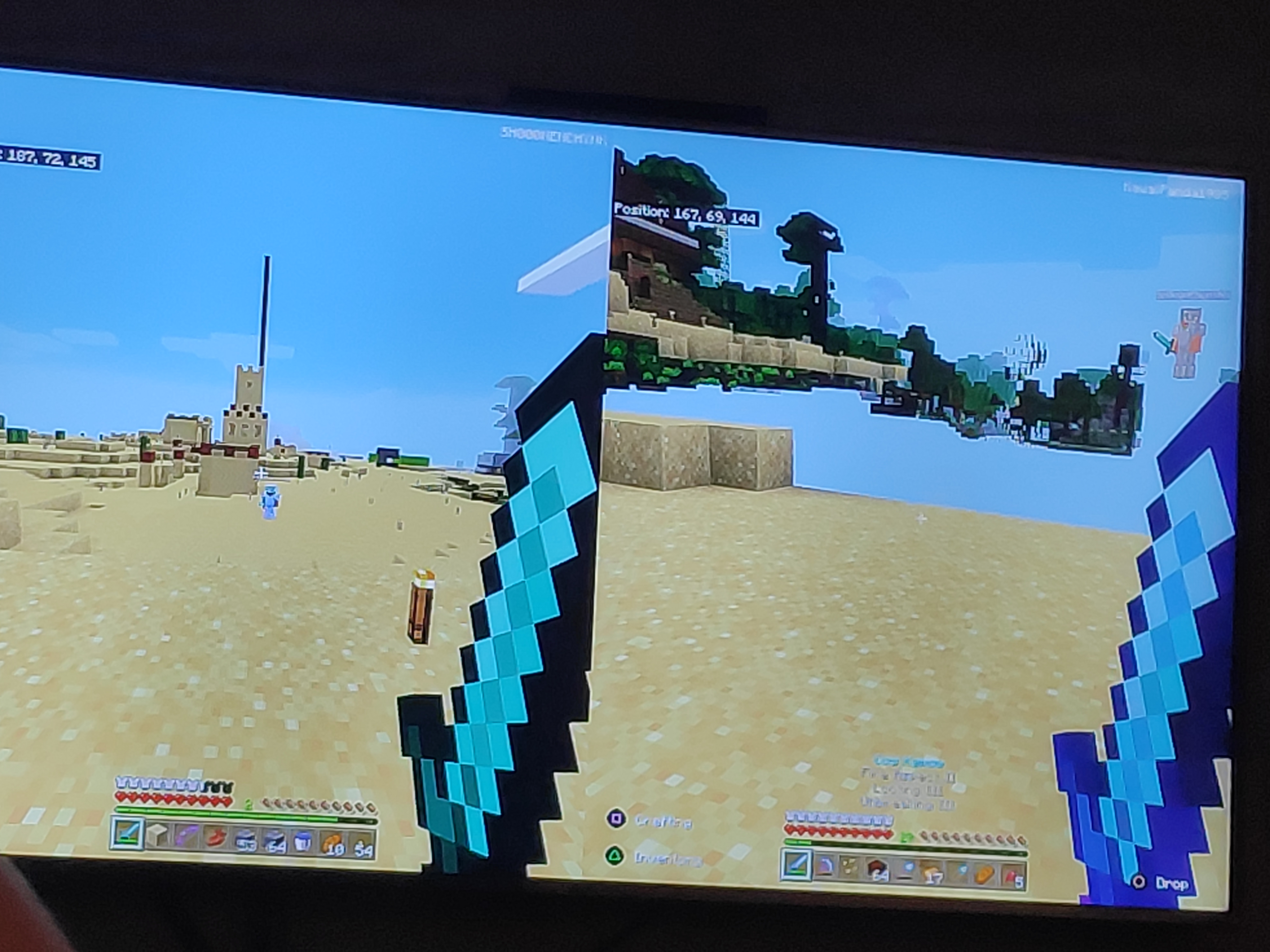 If we're lucky, player 1 and 2 can go the the nether, and player 1 has better chances of loading complete terrain with no hang times or closing the application.
