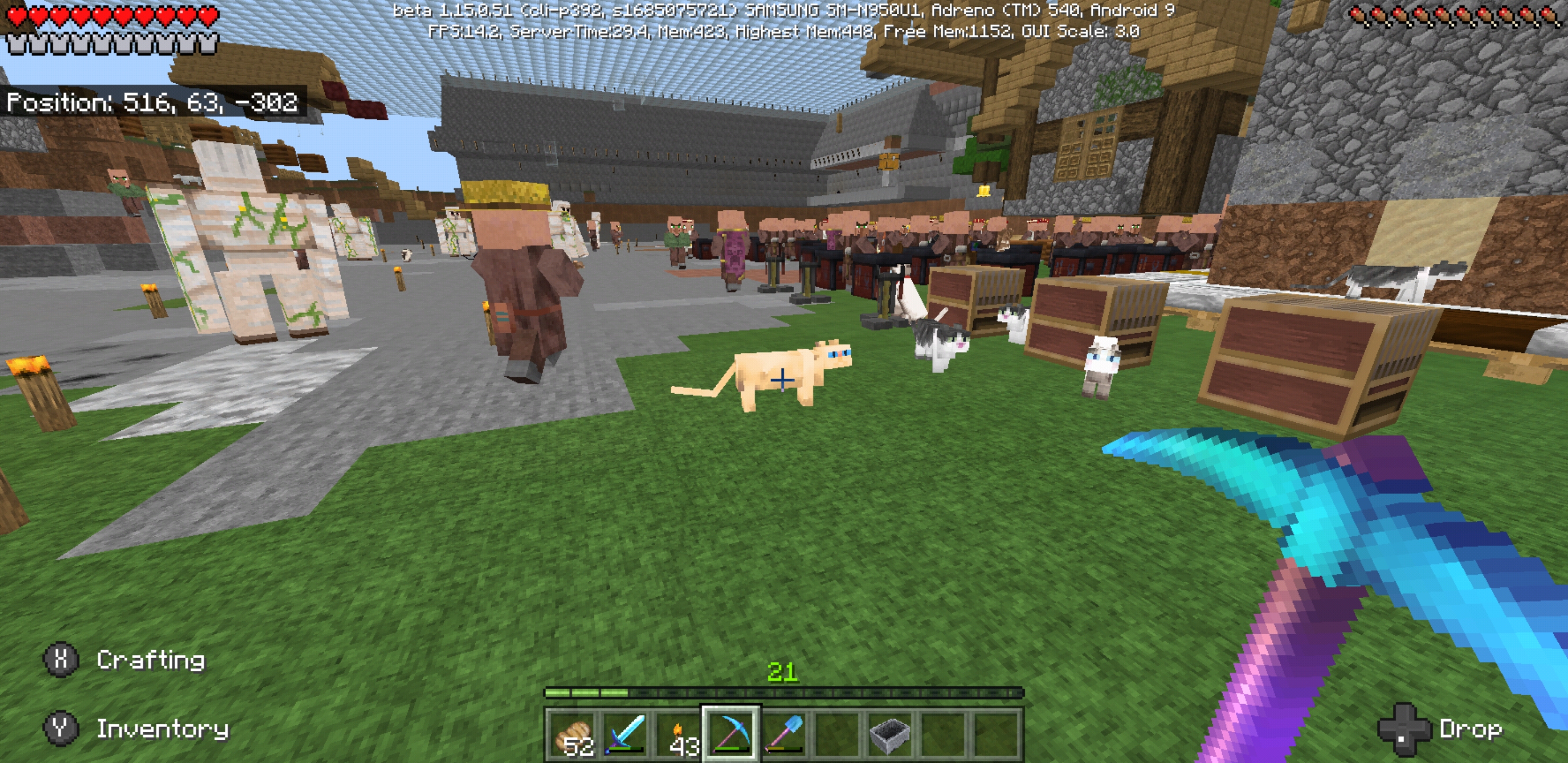 I had the texture pack Clear Craft enabled when I loaded my world into 1.15.0.51 and was met with unbearable lag. I determined that the cause was not from my map wall or too many animals. The map wall screen shot is in my base after I significantly reduced my live stock numbers, down to 2 of each. I went to a village that has spawned 30-50 villagers, second screen shot, and the game operated basically normal with Clear Craft active. It seems to work long as I was far enough away from my base for it to not render, 6 chunks is my render distance. With no texture packs enabled it is running great, 50-60 fps, third screen shot. I think it could be a combination of my automated smelter and my some 20-30 chests, most are over half full.