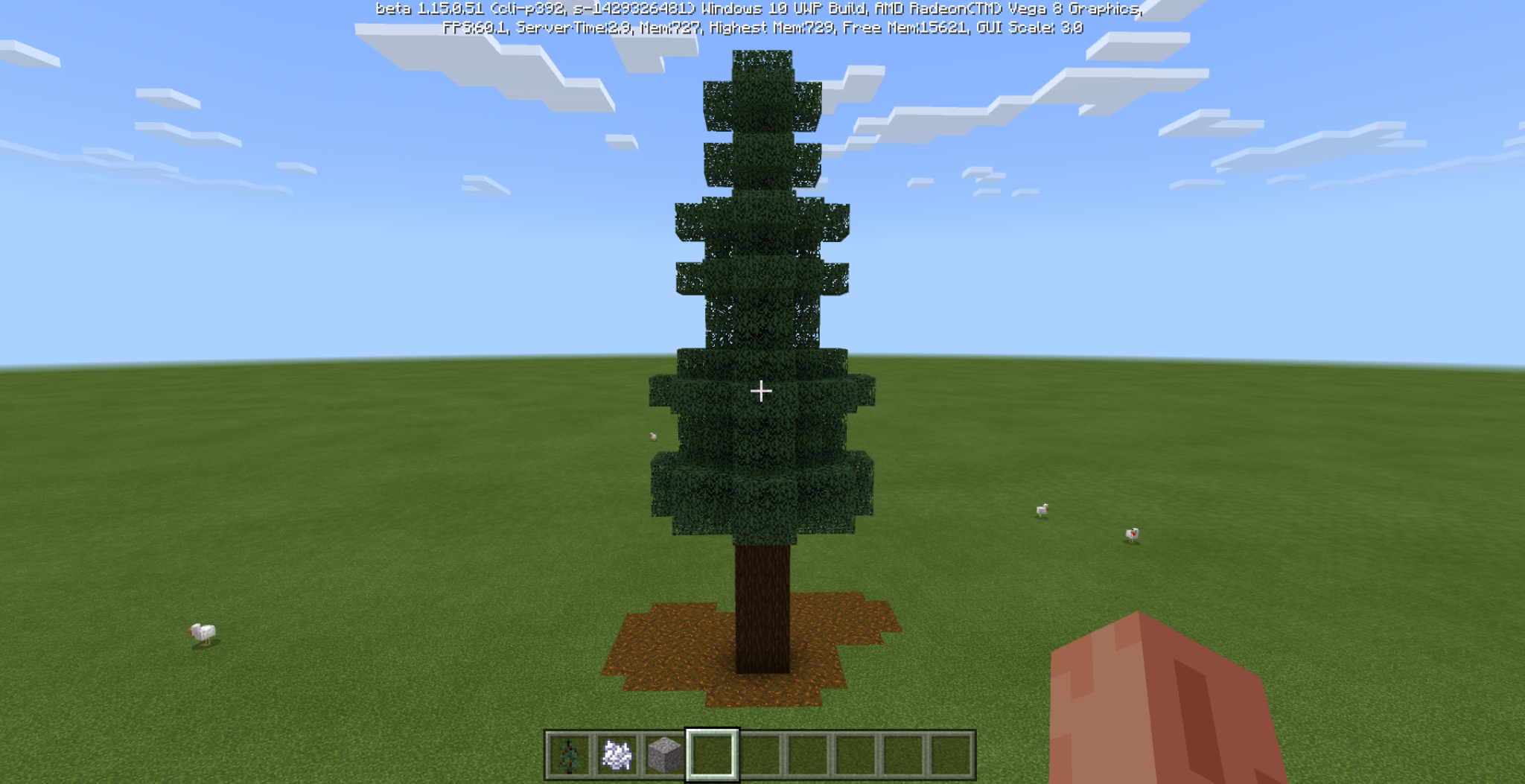When either 1x1 or 2x2 spruce trees are grown from saplings, they generate with a lot of missing log blocks around where leaves appear. Usually it’s a fair amount of the logs that are missing with leaves in its place.