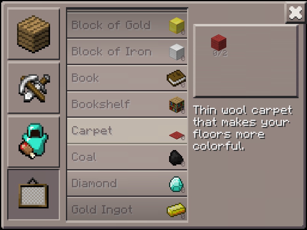 When you are in survival mode, you cannot craft any carpets except red. There are no 'slots' on display in the crafting menu of any carpet except red