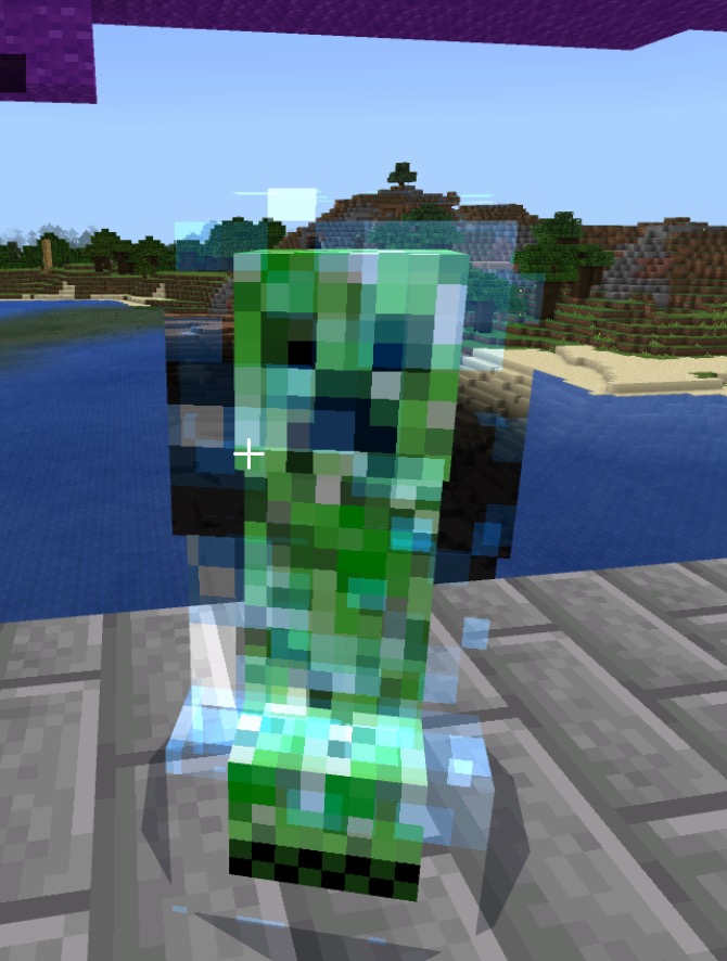 Transparent blocks and rain do not render behind the charged creeper's aura. This issue used to occur with the wither's aura as well, but that was fixed.