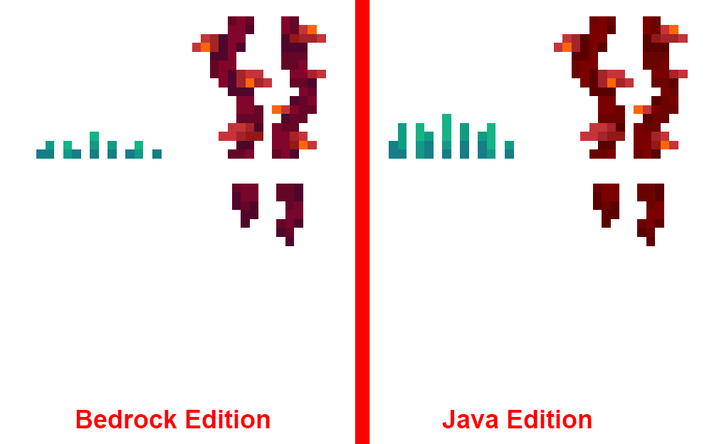 Chiseled Nether Bricks (Uses the 20w15a texture. In 20w16a the texture now resemblesthis reddit post)Fixed in 1.16.0.63Quartz Bricks (Uses the 20w15a texture. In 20w16a of Java Edition, it resemblesthis reddit post)Fixed in 1.16.0.63Zombified Piglin (-Still has hooves; see MC-174537 and loincloth is not mirrored)Hoglin and Zoglin (Separate tusk textures MC-189256)