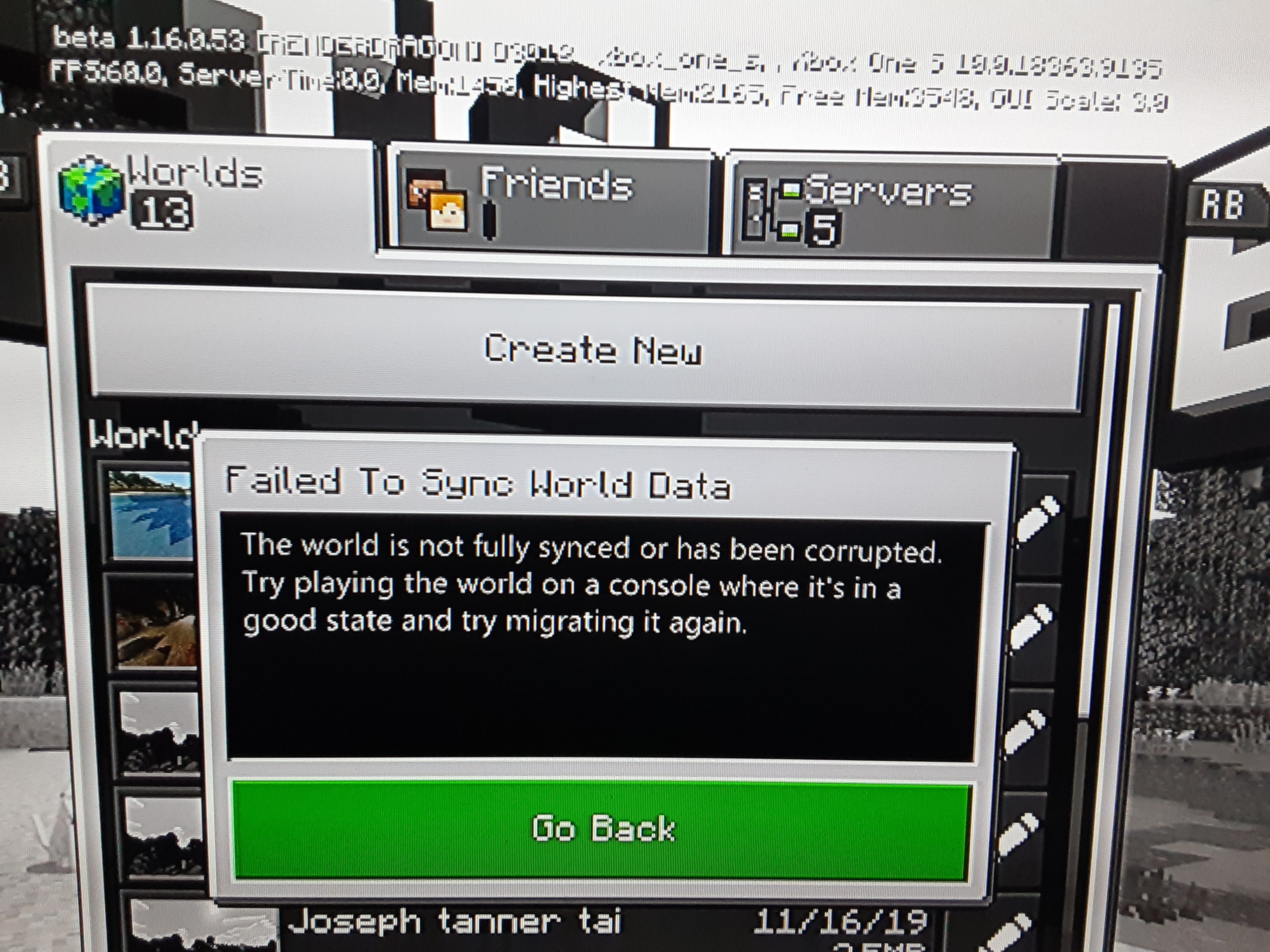 I'm using the beta and when I try to load into my world it shows a pop up saying "syncing world data" and then it will pop up saying " failed to sync world data, the world is not fully synced or has been corrupted. try playing the world on a console where it's in a good state and try migrating it again." please help i don't know how to fix this.