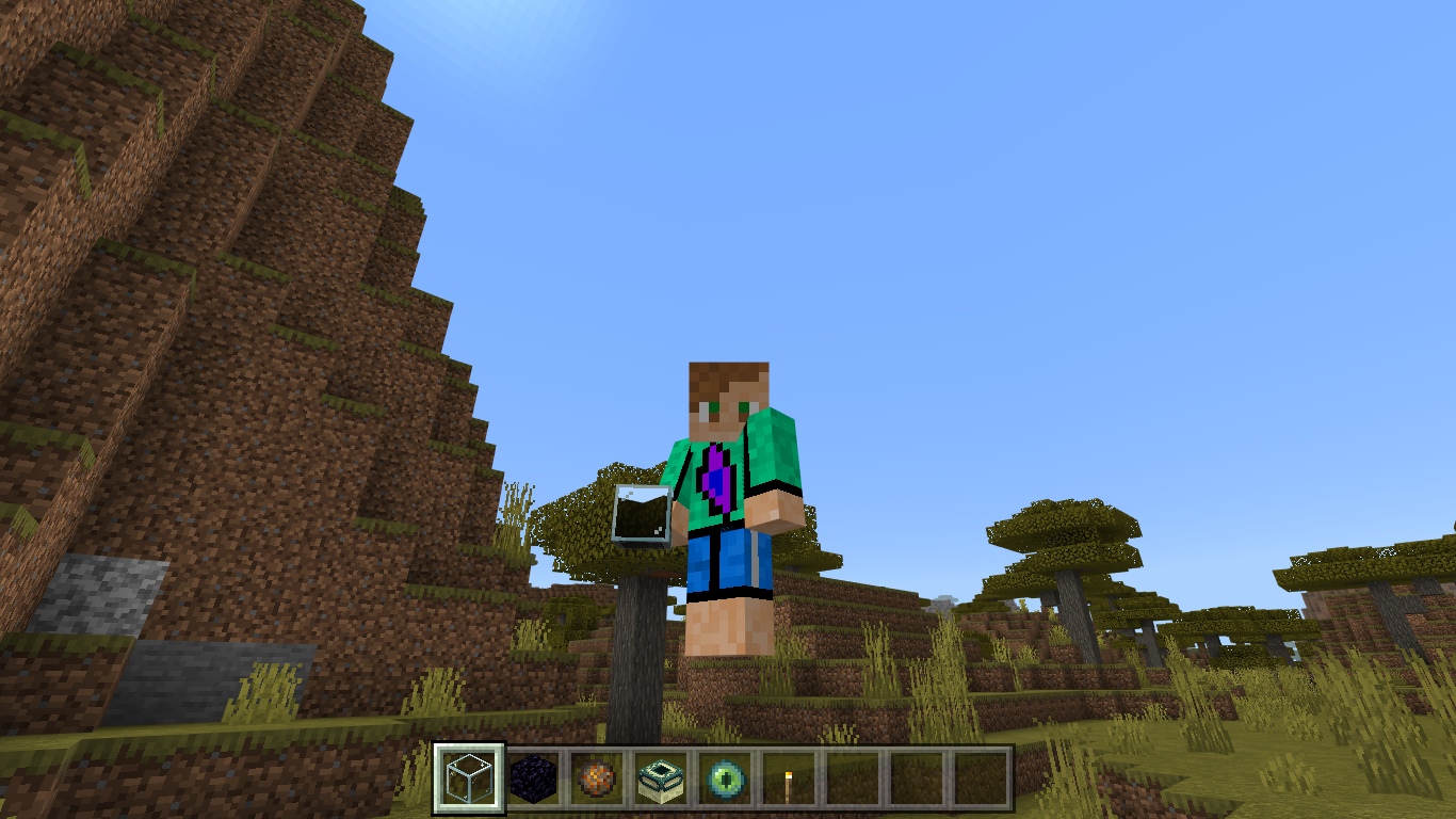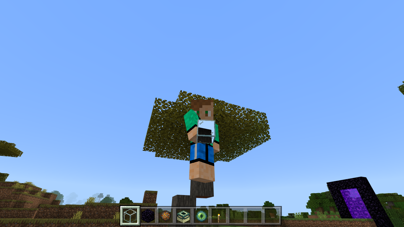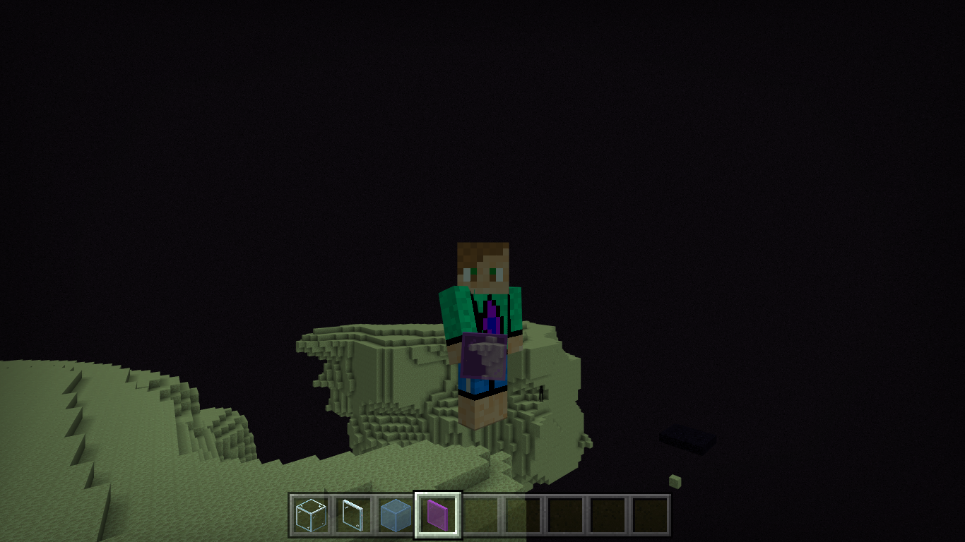 When a player holds glass in their hand and goes into third-person camera view, any type of entity; including the player; will not render in behind the held glass. Water, some of the leaves on trees, chests, mobs, sugarcane, grass, fire, iron-bars and the sun, moon and sky colour do not show. Nether portal tiles don't load; however; end portal tiles do. The rendering of leaves is also extremely inconsistent. Some leaves on some trees will load, but some do not. The rendered leaves are also dark. It also appears to load in some of a chunk if the chunk is far away, but loads the entire chunk when the player gets closer. In on of the screenshots my player has clearly loaded chunks behind me in the End; but some of the chunk is not there. Glass panes, stained glass and stained glass panes have the same effect.