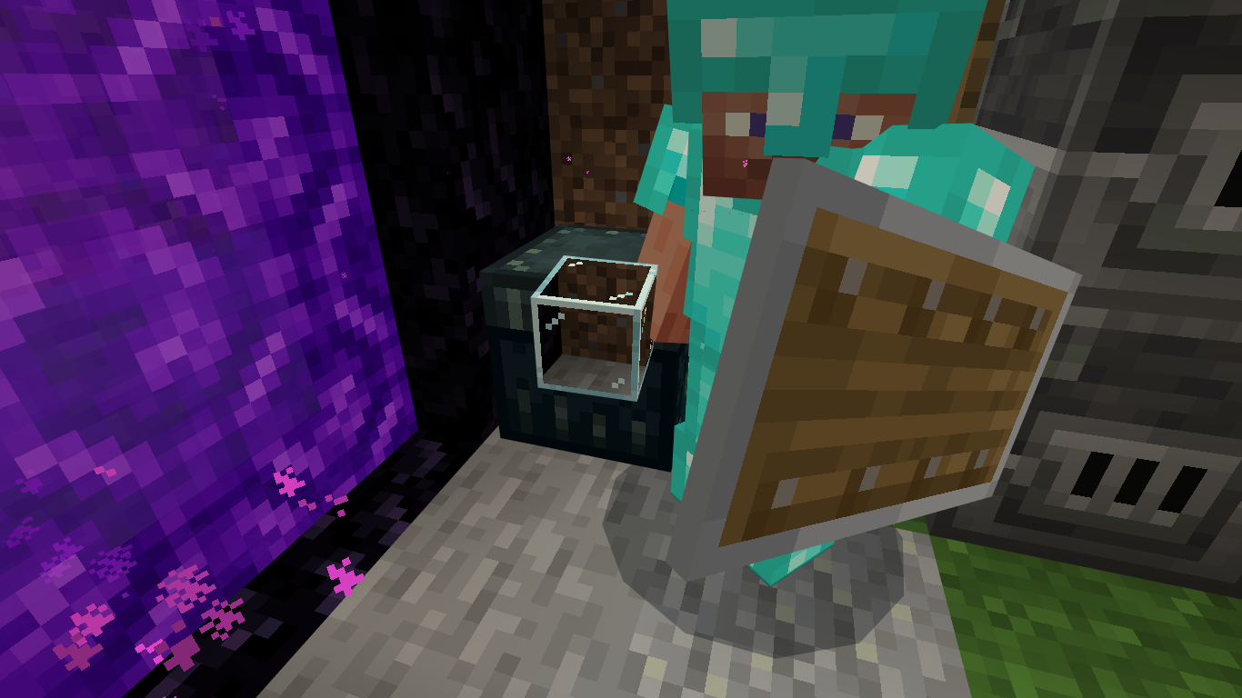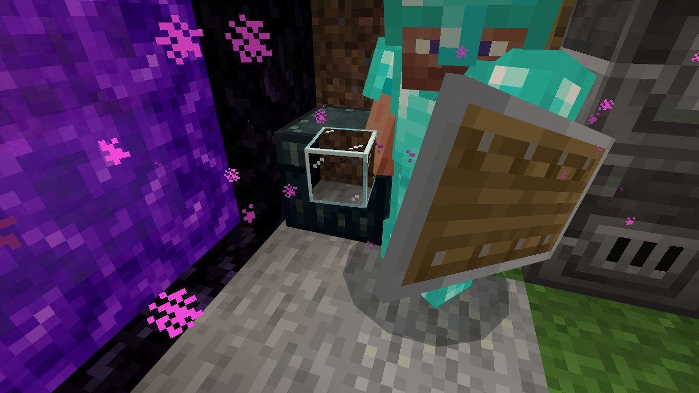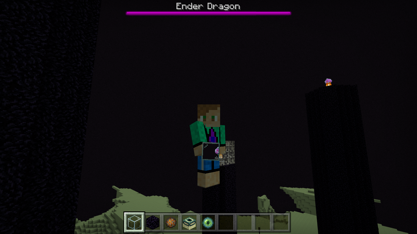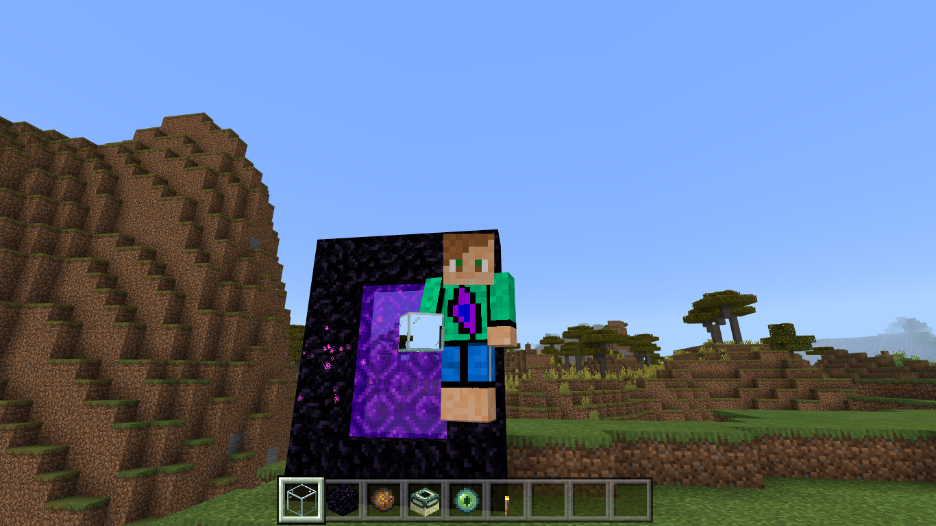 When a player holds glass in their hand and goes into third-person camera view, any type of entity; including the player; will not render in behind the held glass. Water, some of the leaves on trees, chests, mobs, sugarcane, grass, fire, iron-bars and the sun, moon and sky colour do not show. Nether portal tiles don't load; however; end portal tiles do. The rendering of leaves is also extremely inconsistent. Some leaves on some trees will load, but some do not. The rendered leaves are also dark. It also appears to load in some of a chunk if the chunk is far away, but loads the entire chunk when the player gets closer. In on of the screenshots my player has clearly loaded chunks behind me in the End; but some of the chunk is not there. Glass panes, stained glass and stained glass panes have the same effect.