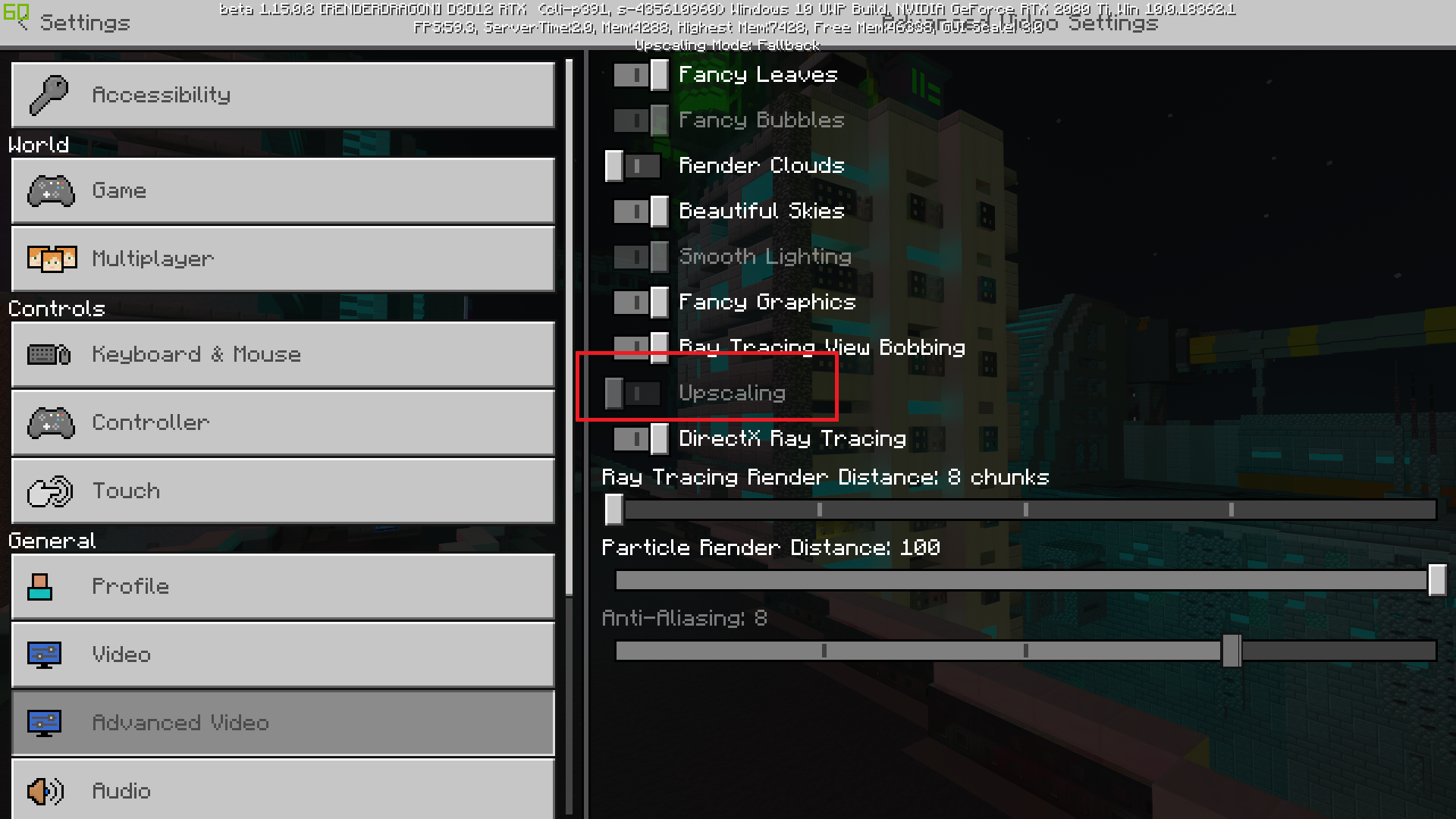 Unable to select upscaling, it is grayed out. If I try to do it from settings in the main page, it has an information saying it can only be enabled in a RTX world. If I start a RTX world (official NVIDIA ones), it is still grayed out, but no information why it is grayed out.