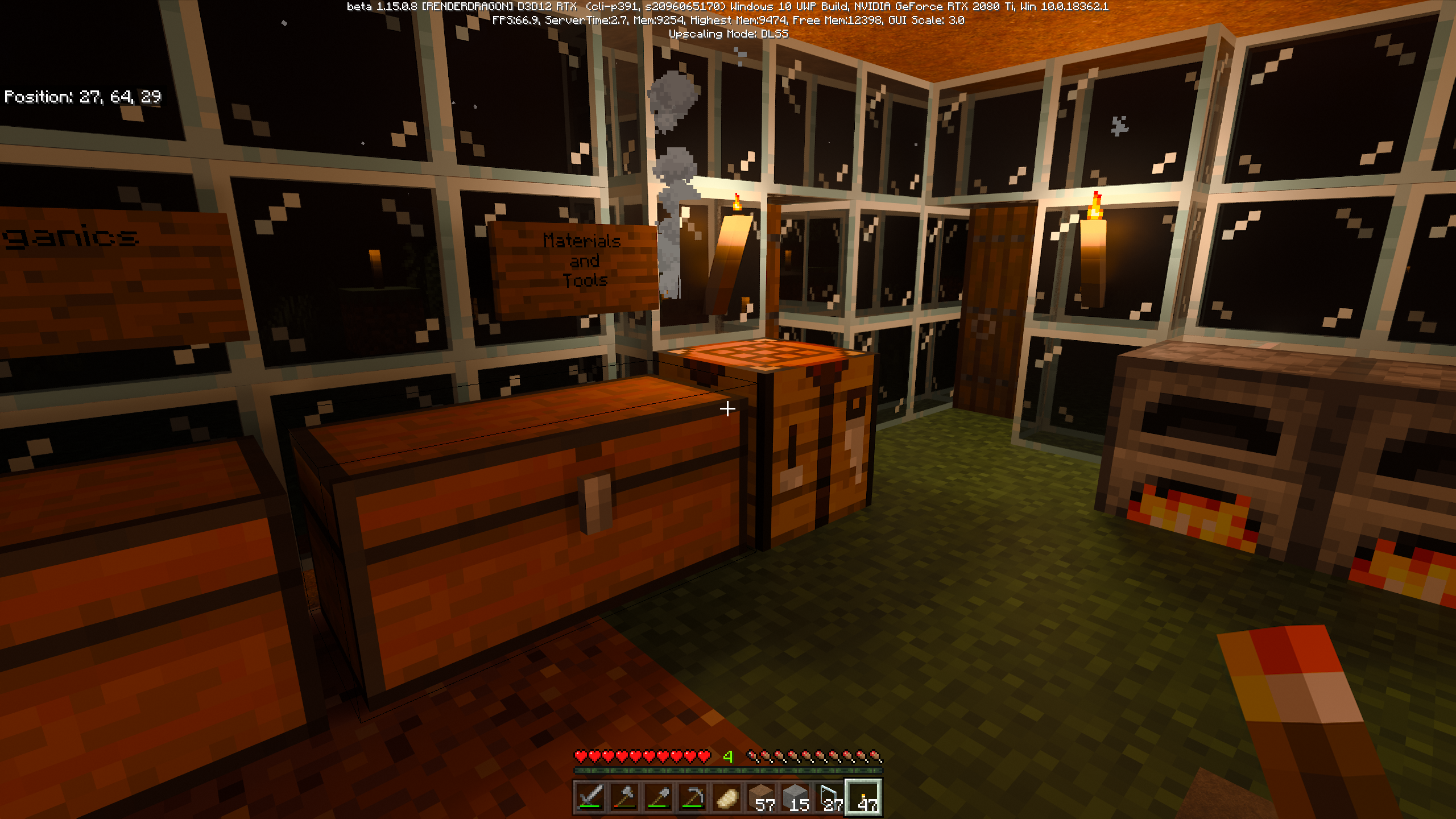 Smoke from a campfire on the far side of a glass block renders such that appears on the near side. For extra fun, a torch on a glass block causes a different effect. Screenshot attached.