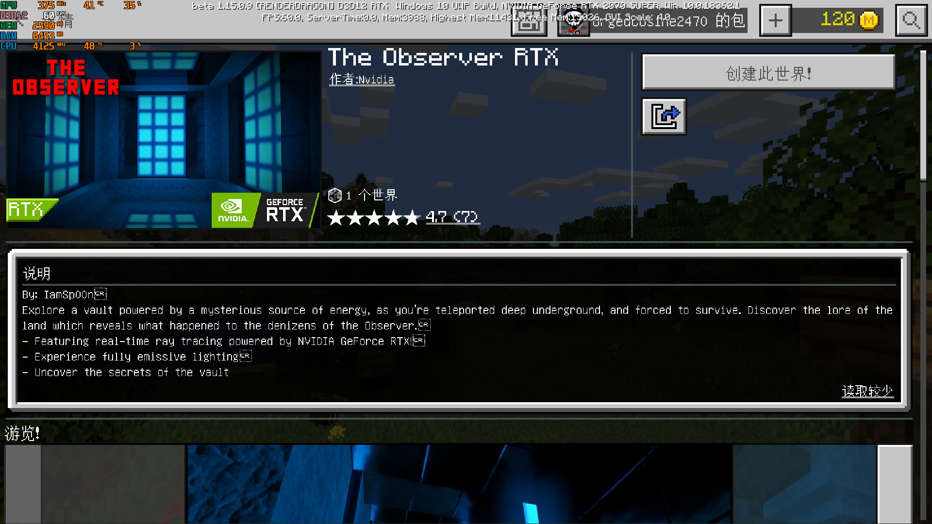 "The Observer RTX"map resourcepacks about GPU EME Full load, Looks only 3fps!Memory usage is too high.
