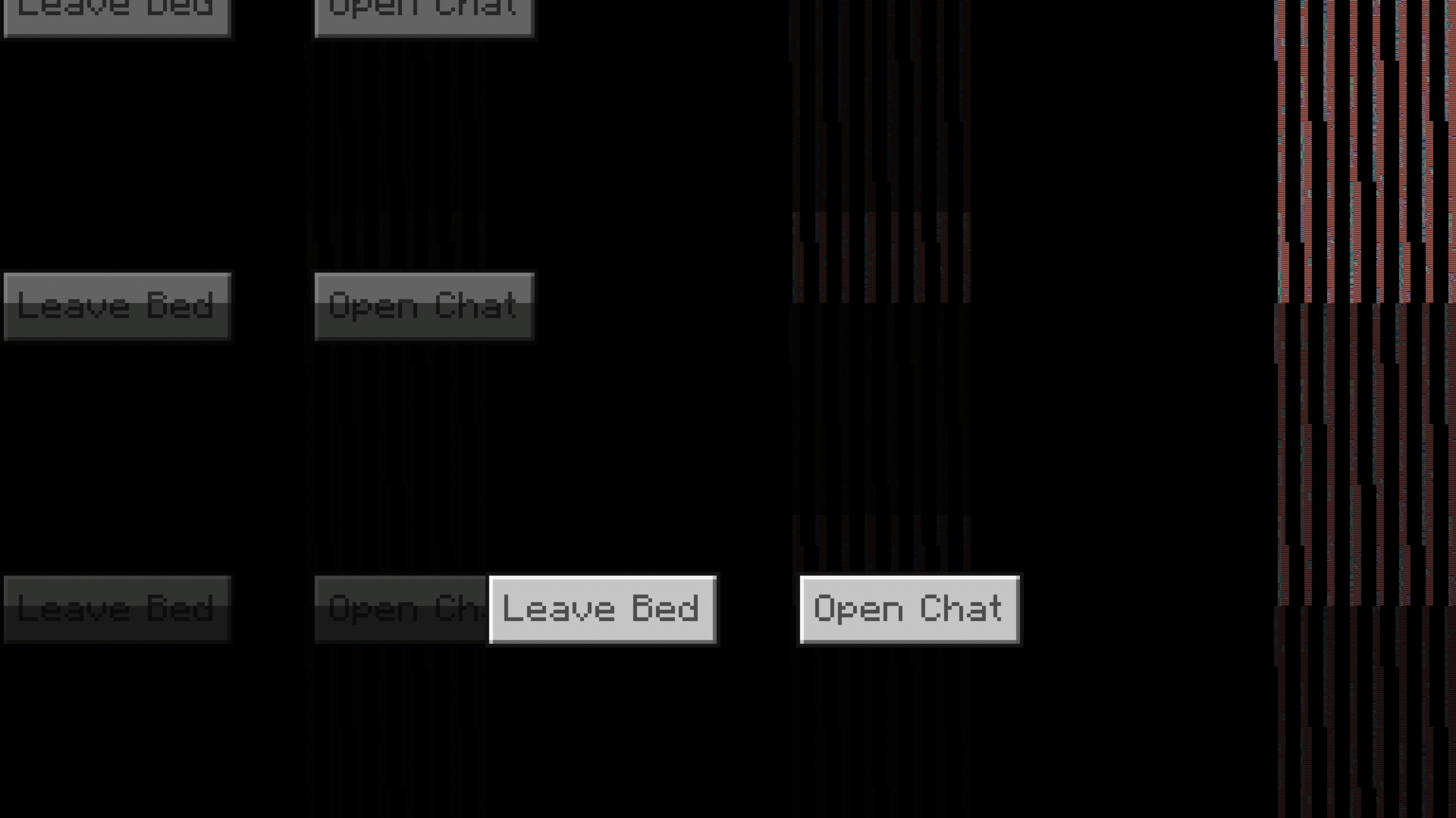 Loading the world would cause this (leave bed) (open chat) screen to appear. The background was back and a few seconds later a lot of GUI screens appeared followed by a game crash.