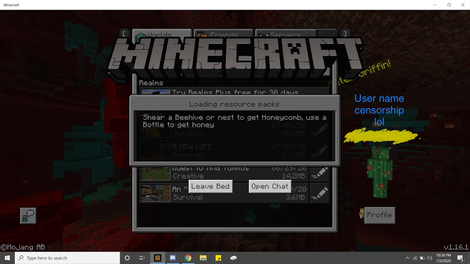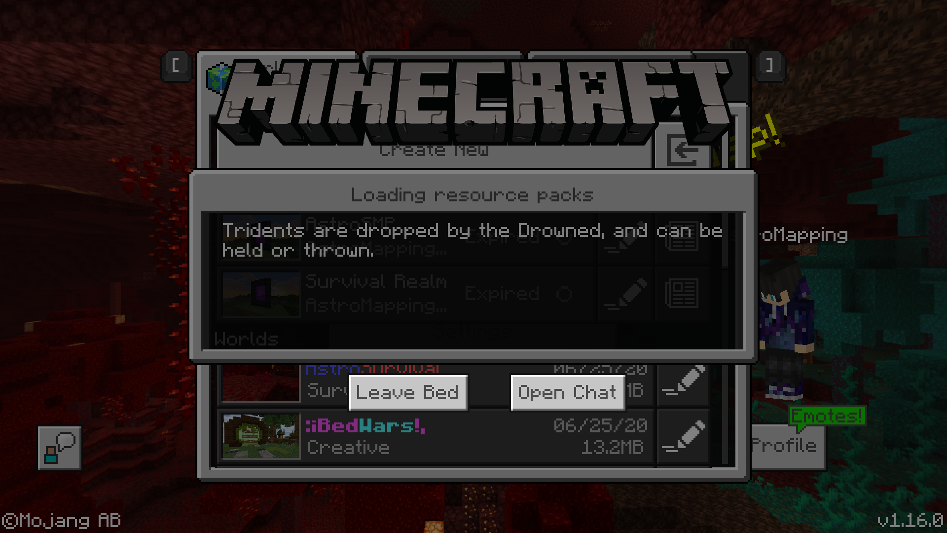 I tried loading into my world and was met with a black screen that said (leave bed) and (open chat). I didn't even log out in a bed.