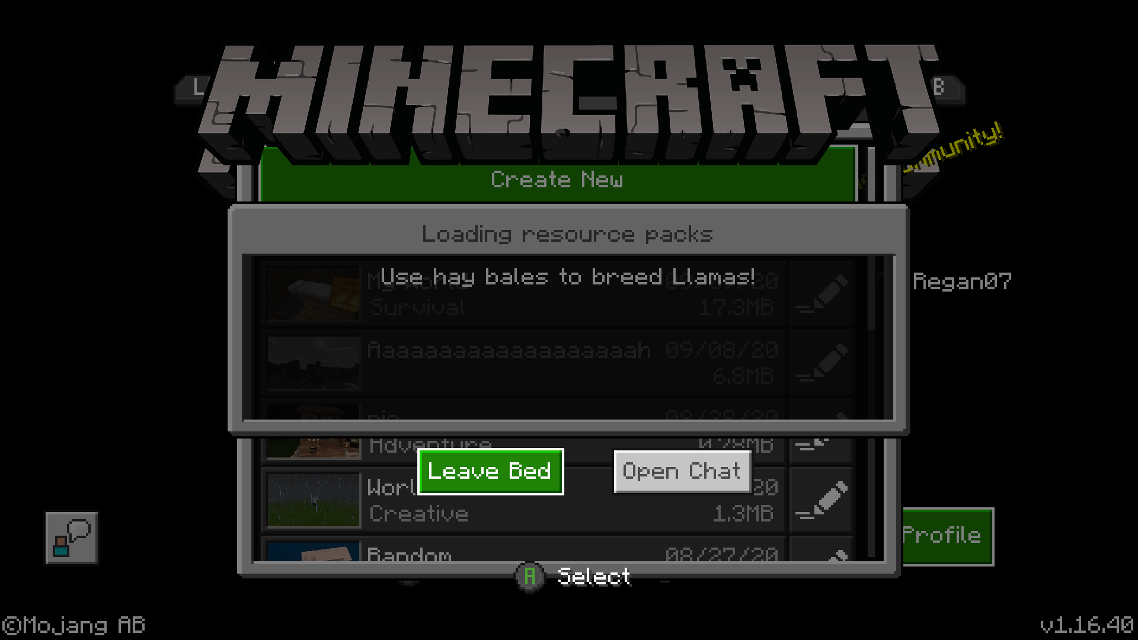 If I pressed A on either (leave bed) or (open chat) it would overlay a transparent main menu world selection screen in front of this black screen with (leave bed) and (open chat). I could not do anything once the world selection screen was loaded.