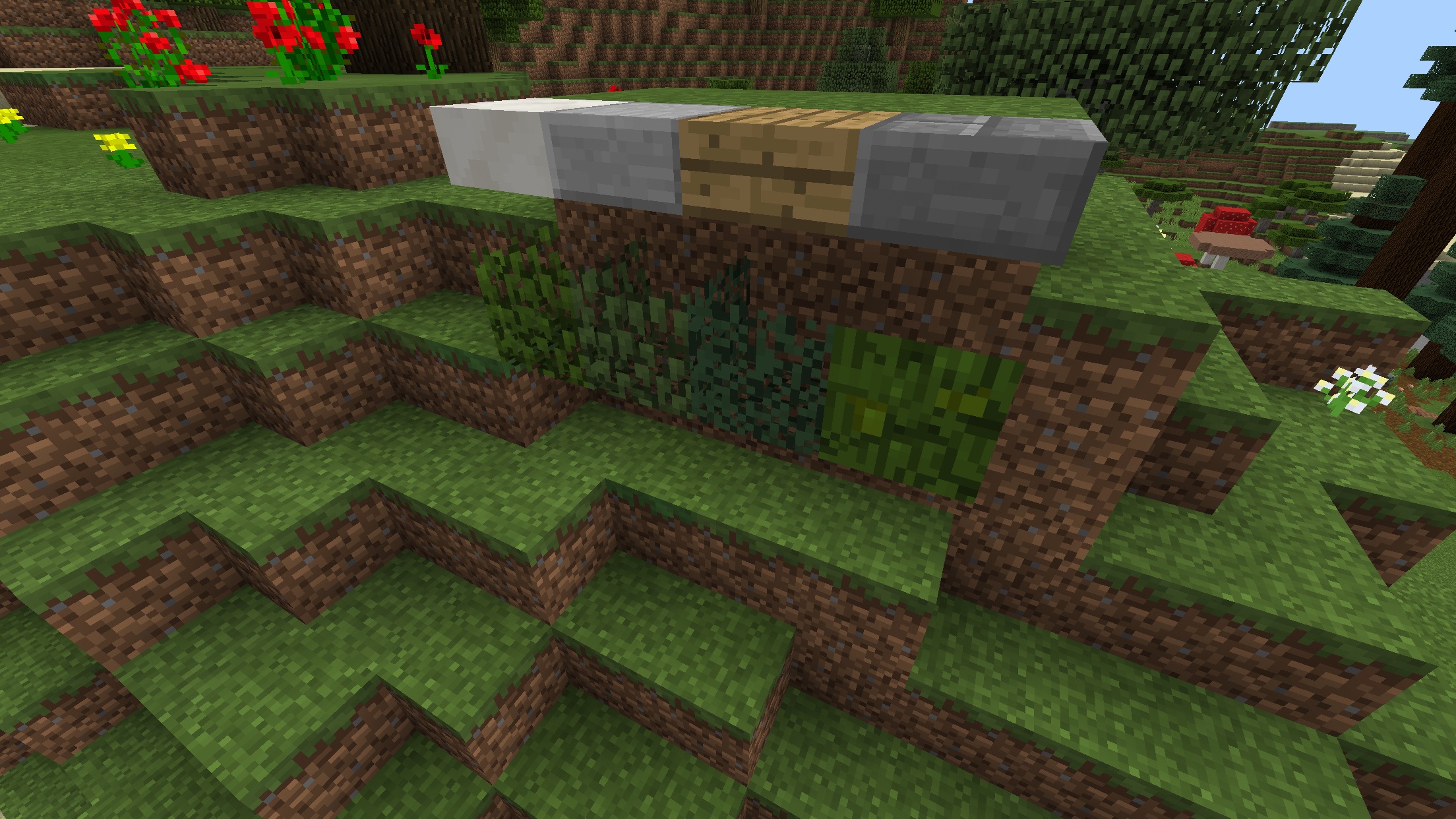 If upper slabs are placed above leaves, the texture for the top of the leaves disappears. This happens with any slabs or leaves, on fancy and normal graphics.