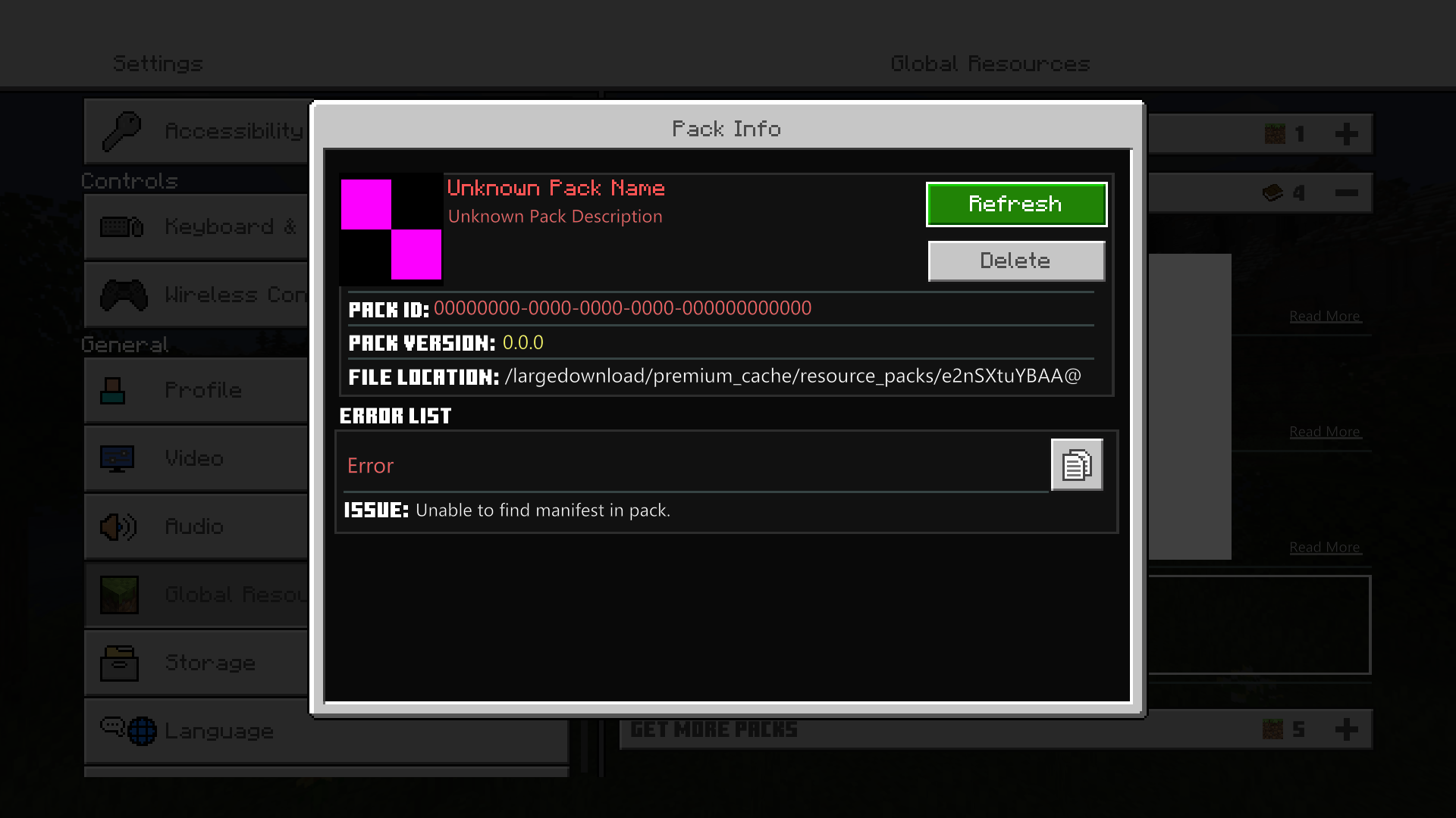 I am having the same issue. The Mizuno texture pack I bought had this bug before, but it was fixable by deleting and reinstalling the texture pack. Now, since the latest update, nothing seems to fix it. It’s disappointing because I purchased this pack and now I can’t use it. In my global resources it is listed as “pack.name / pack.description” and there is also an error listed underneath that matches the screenshot above, “Unknown Pack Name / Unknown Pack Description / Pack ID: 00000000-0000 etc / Error Issue: Unable to find manifest in pack”
