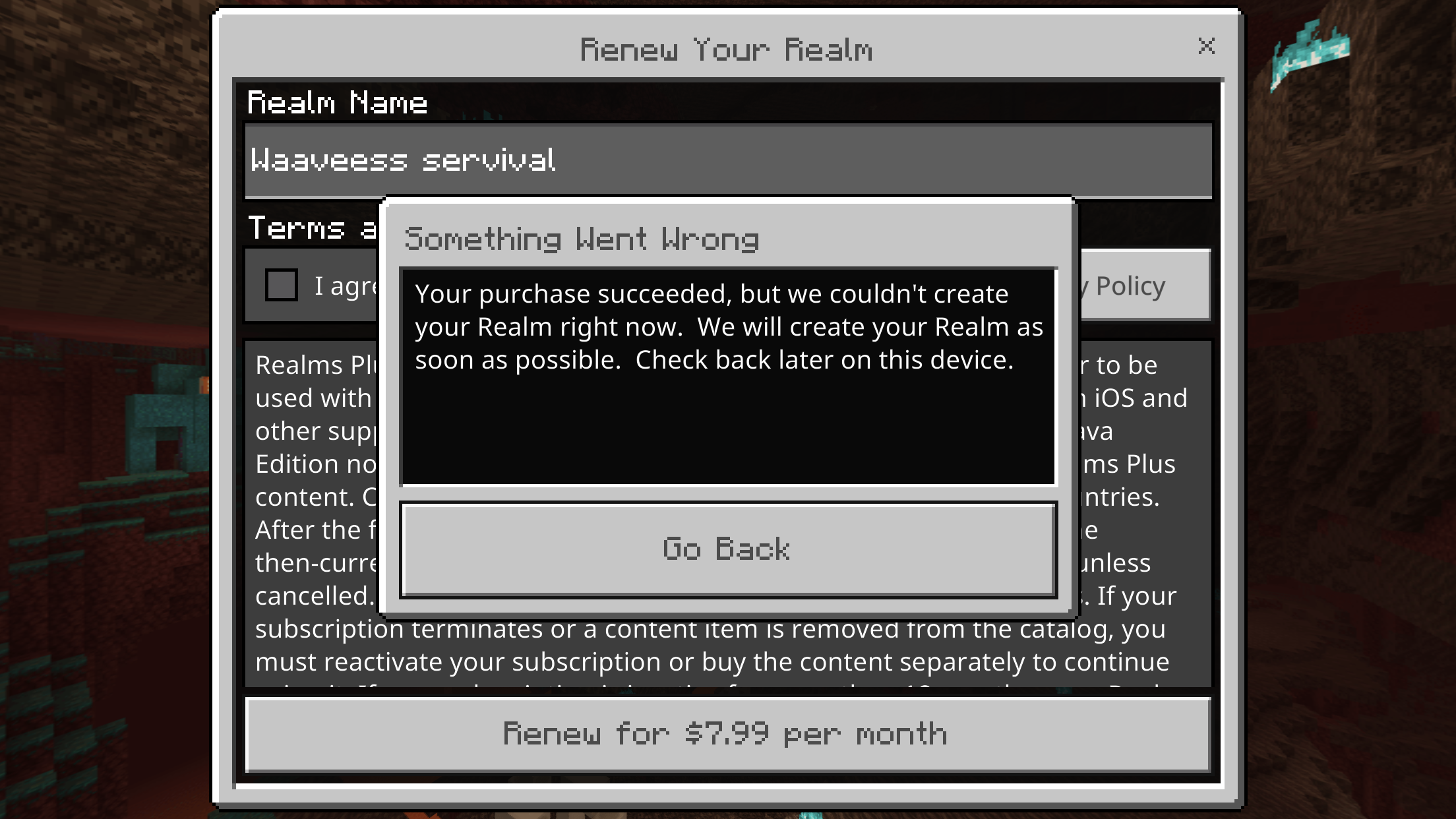 Hi my name is Miguel and I try renewing my realm but it keeps showing me this this has took 16$ away from my account but I just need this problem solved to get my world back that took so long to build.