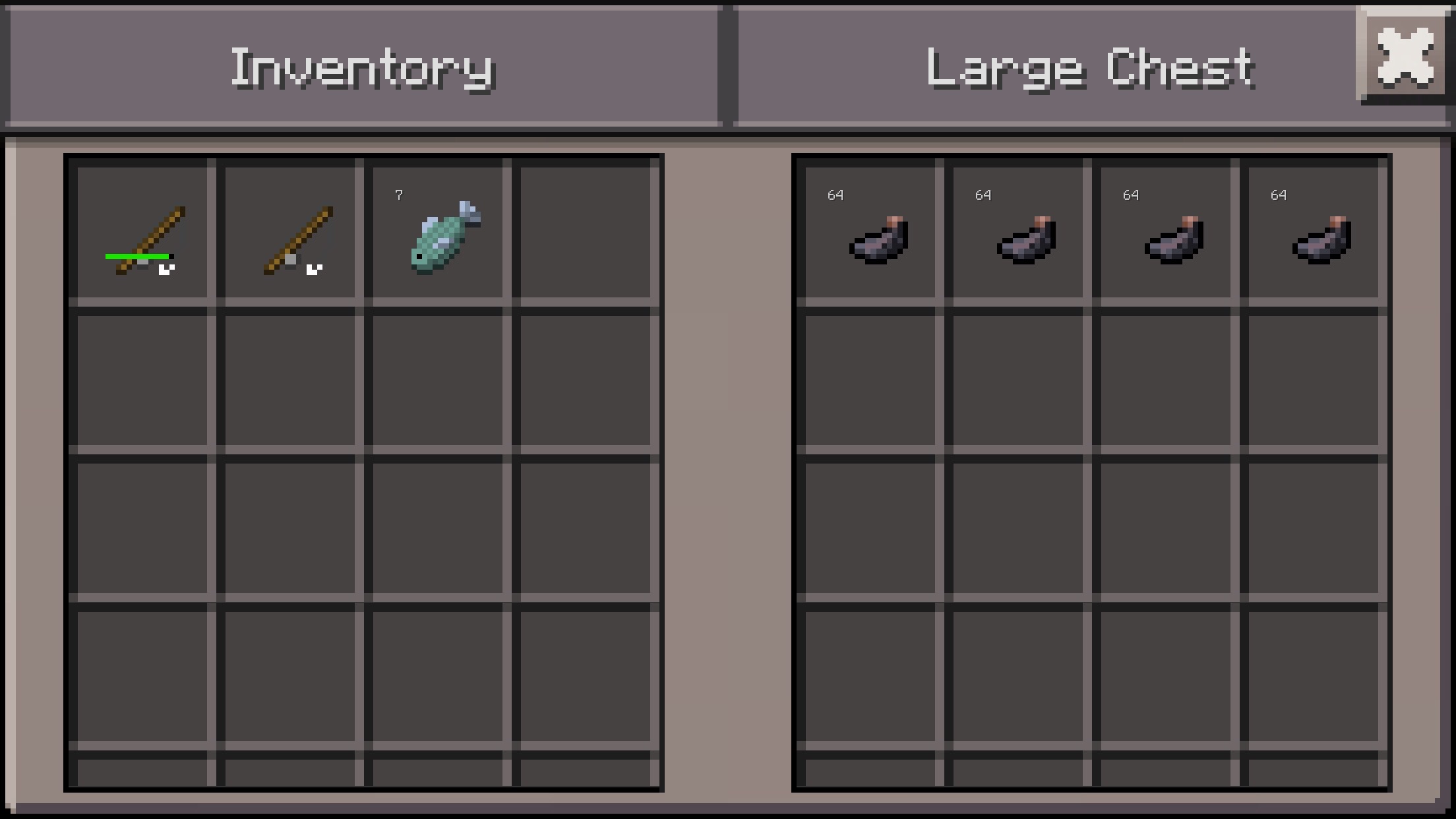 Attempting to move the ink sac into a chest results in the inventory number being changed from that of zero sacks (darkened icon) to a 'stack' of 256 ink sacs (listed as 99+), which split up properly into four stacks once inside the chest.