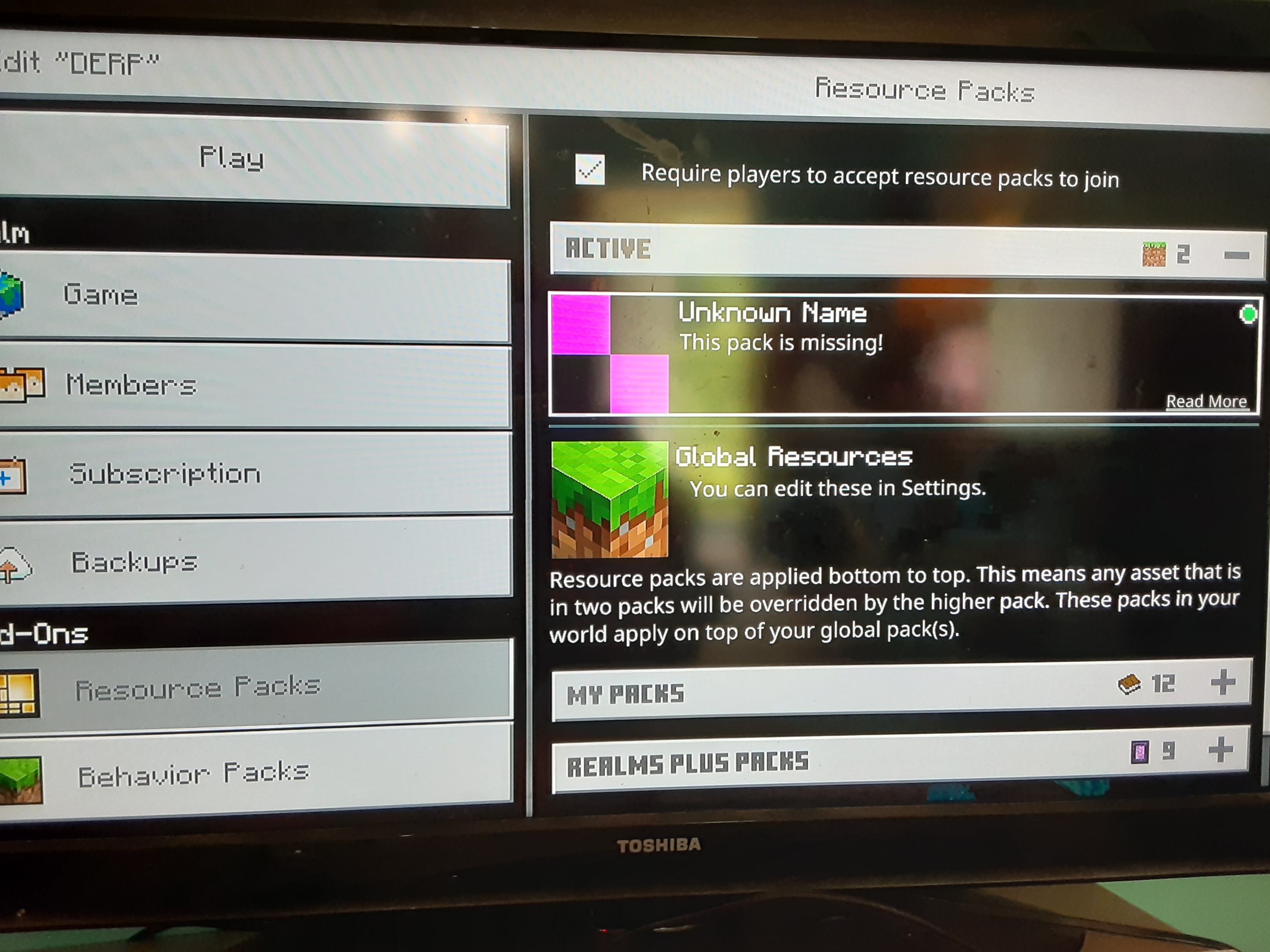 Ive Uploaded My recourse pack to my realm multiple t and toggled Force Players to download Pack to join