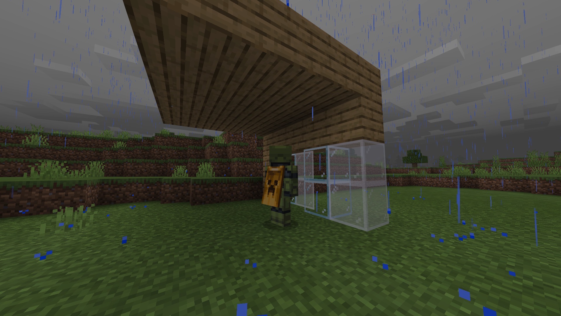 When it is raining, rain is not visible through glass, glass panes, stained glass, and stained glass panes. The water droplets from the rainfall are visible however. Rain is also seen going through blocks when in third-person mode, but it still isnβt visible through glass, glass panes, stained glass, and stained glass panes.