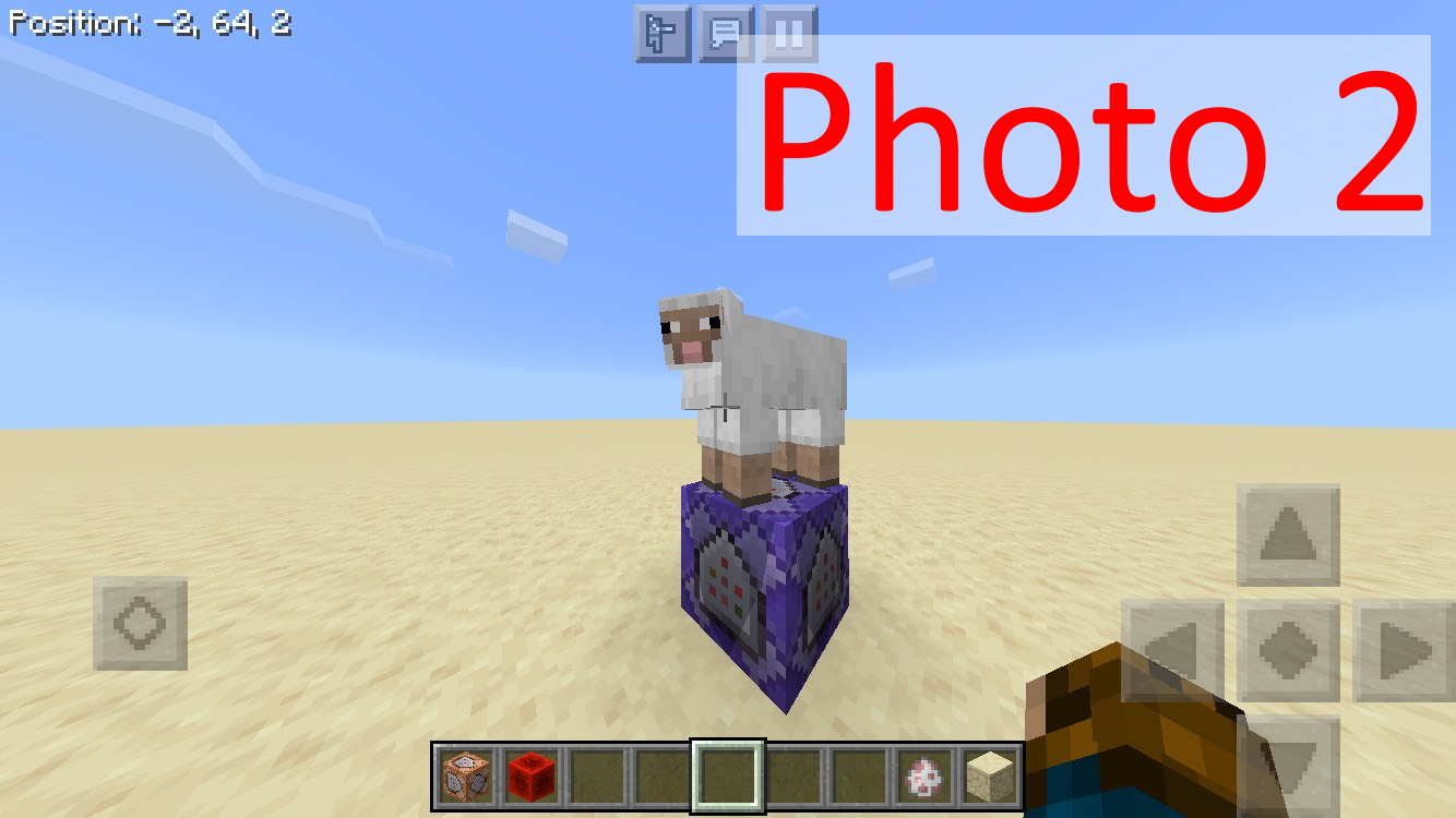 -Photo 2: The command block has the next command: "/tp @e[type=sheep] ~ ~0.5 ~ ~ ~". You can't see it in the photo, but the sheep is changing the direction where it's looking as it normaly does (instead of looking allways to the same direction).